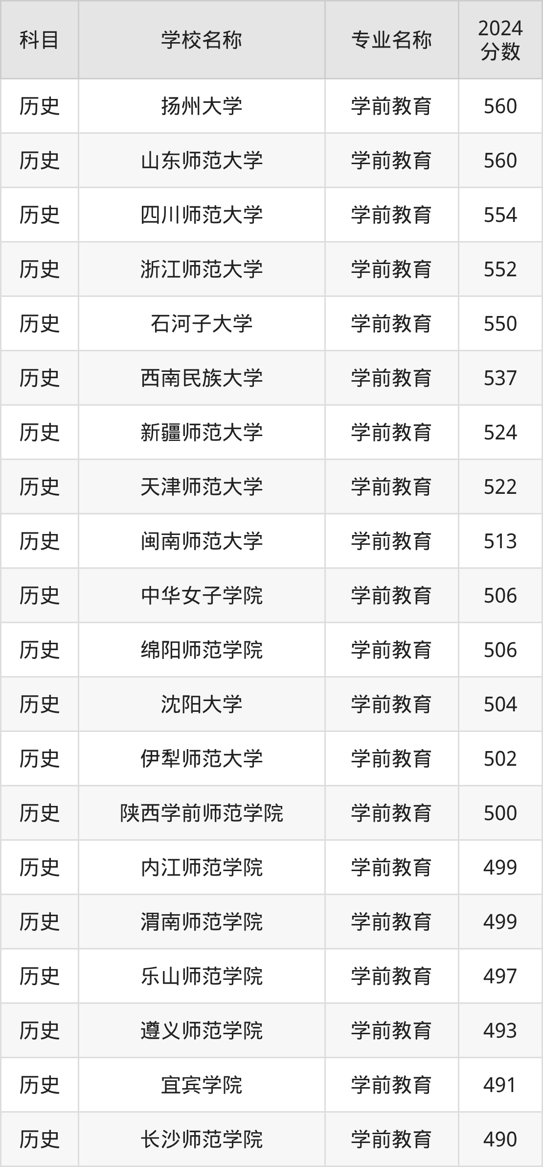 通过上文大家可以知晓,在甘肃省内招学前教育专业的院校数量较少,所以下文将为2026届高考生继续展示:省外大学的学前教育专业2024年在甘肃高考的录取情况,包含扬州大学、山东师范大学、四川师范大学、浙江师范大学、石河子大学。