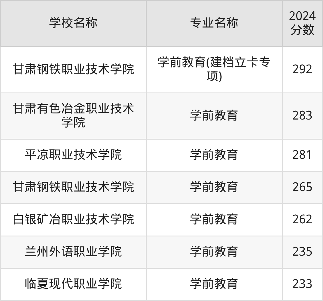 | 甘肃有色冶金职业技术 学院 | 学前教育 | 233 |