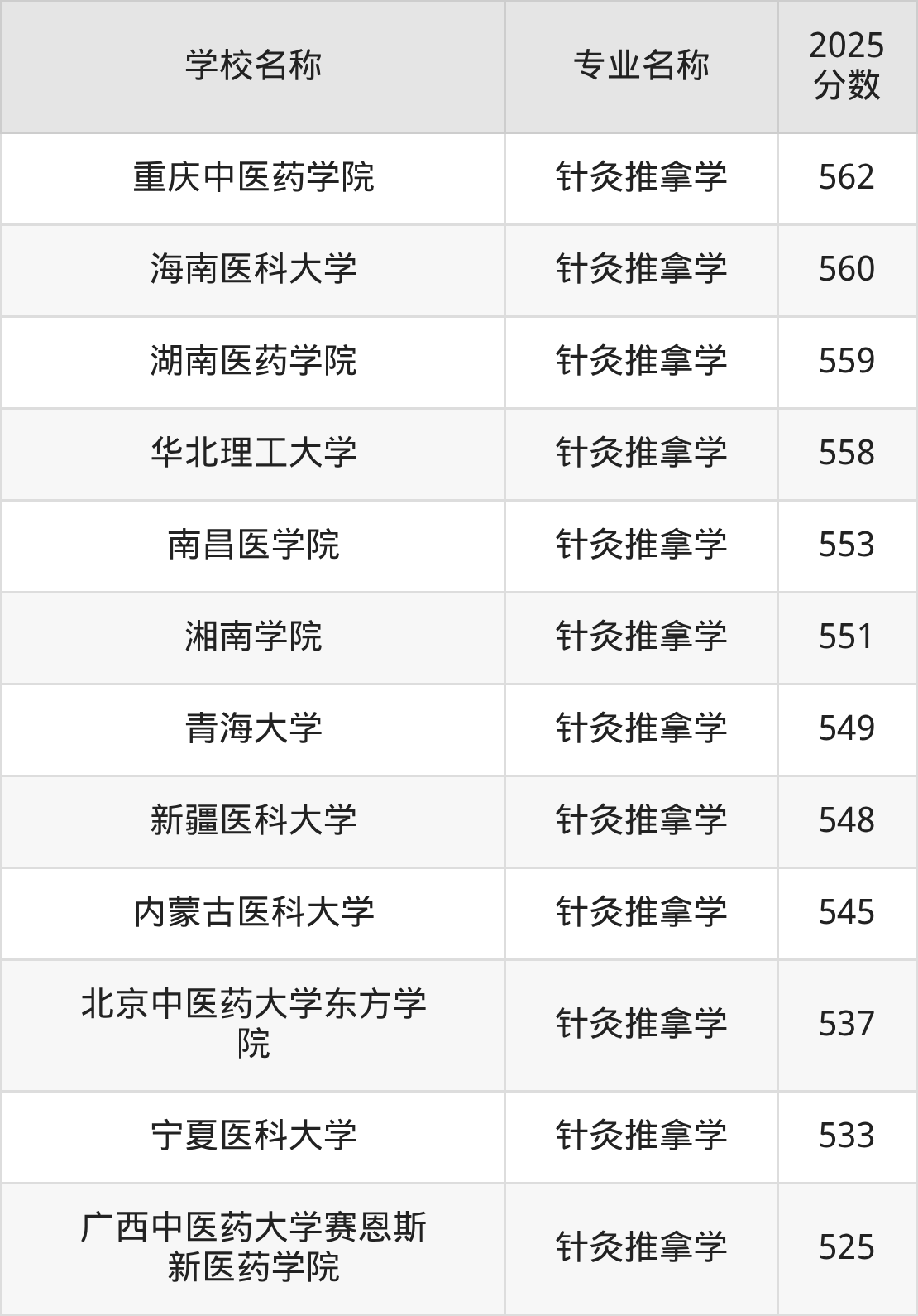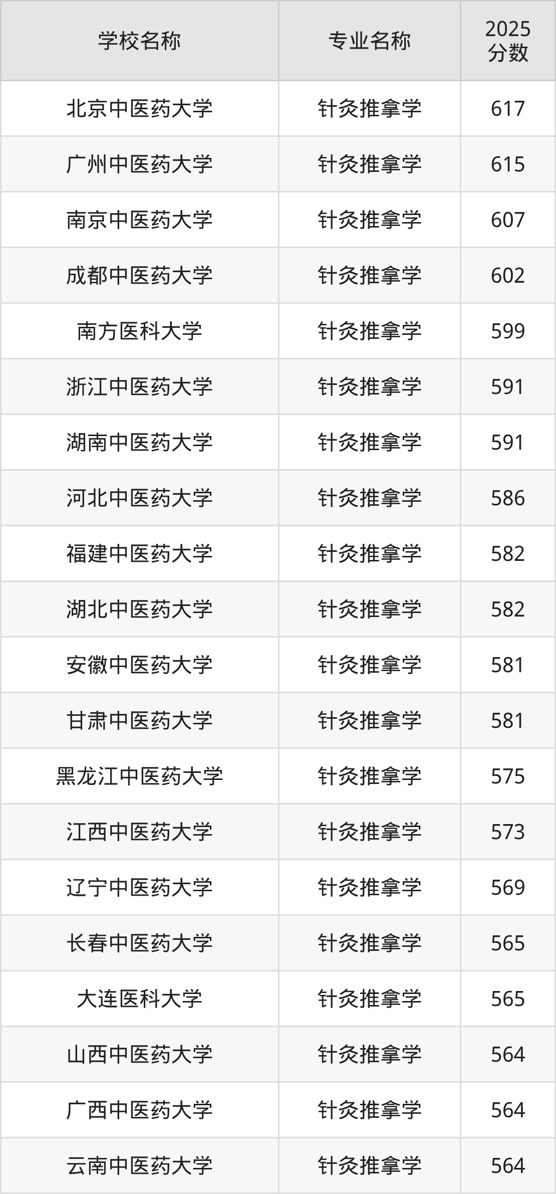 | 山东中医药大学 | 针灸推拿学 | 536 |