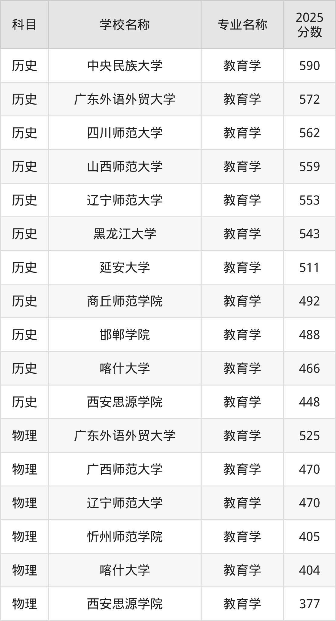 通过上文大家可以知晓,在吉林省内招教育学专业的院校数量较少,所以下文将为2026届高考生继续展示:省外大学的教育学专业2025年在吉林高考的录取情况,包含中央民族大学、广东外语外贸大学、四川师范大学、山西师范大学、辽宁师范大学。