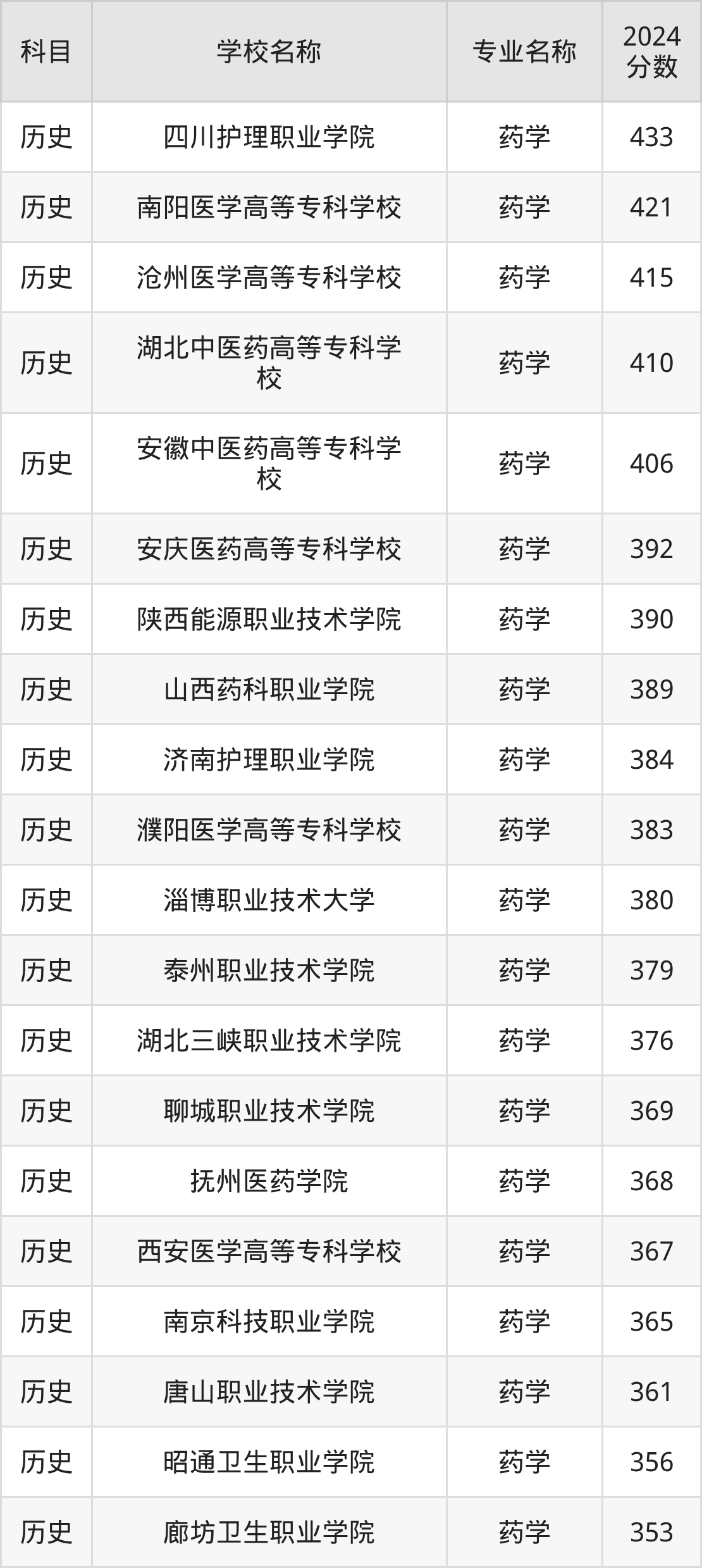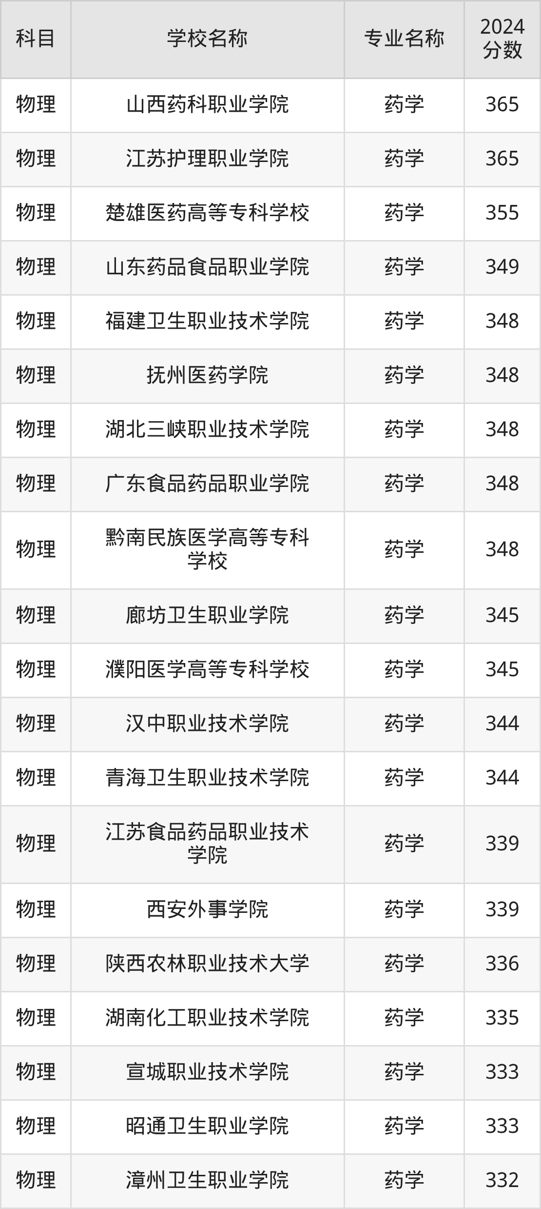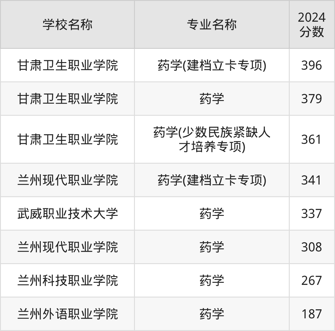 | 甘肃卫生职业学院 | 药学 | 350 |