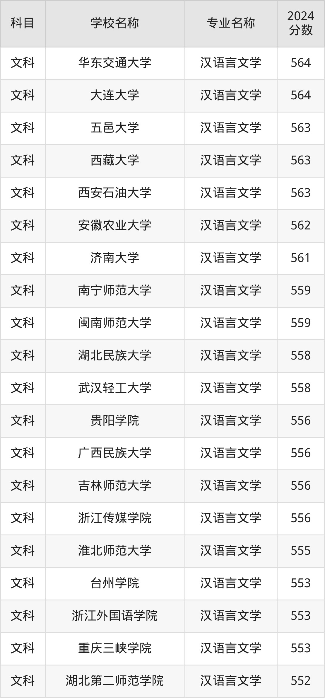 | 西南林业大学 | 汉语言文学(校 本部) | 553 |