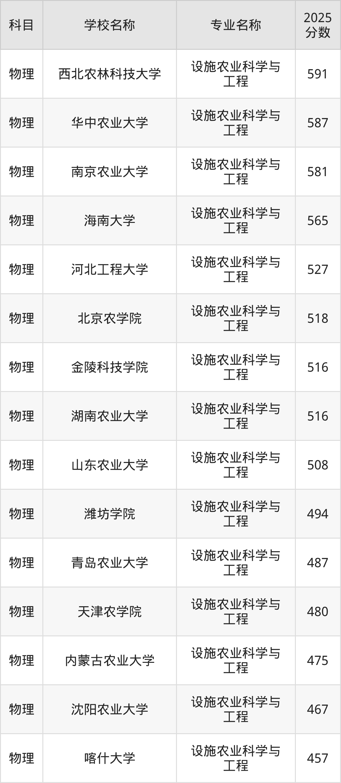 通过上文大家可以知晓,在山西省内招设施农业科学与工程专业的院校数量较少,所以下文将为2026届高考生继续展示:省外大学的设施农业科学与工程专业2025年在山西高考的录取情况,包含西北农林科技大学、华中农业大学、南京农业大学、海南大学、河北工程大学。