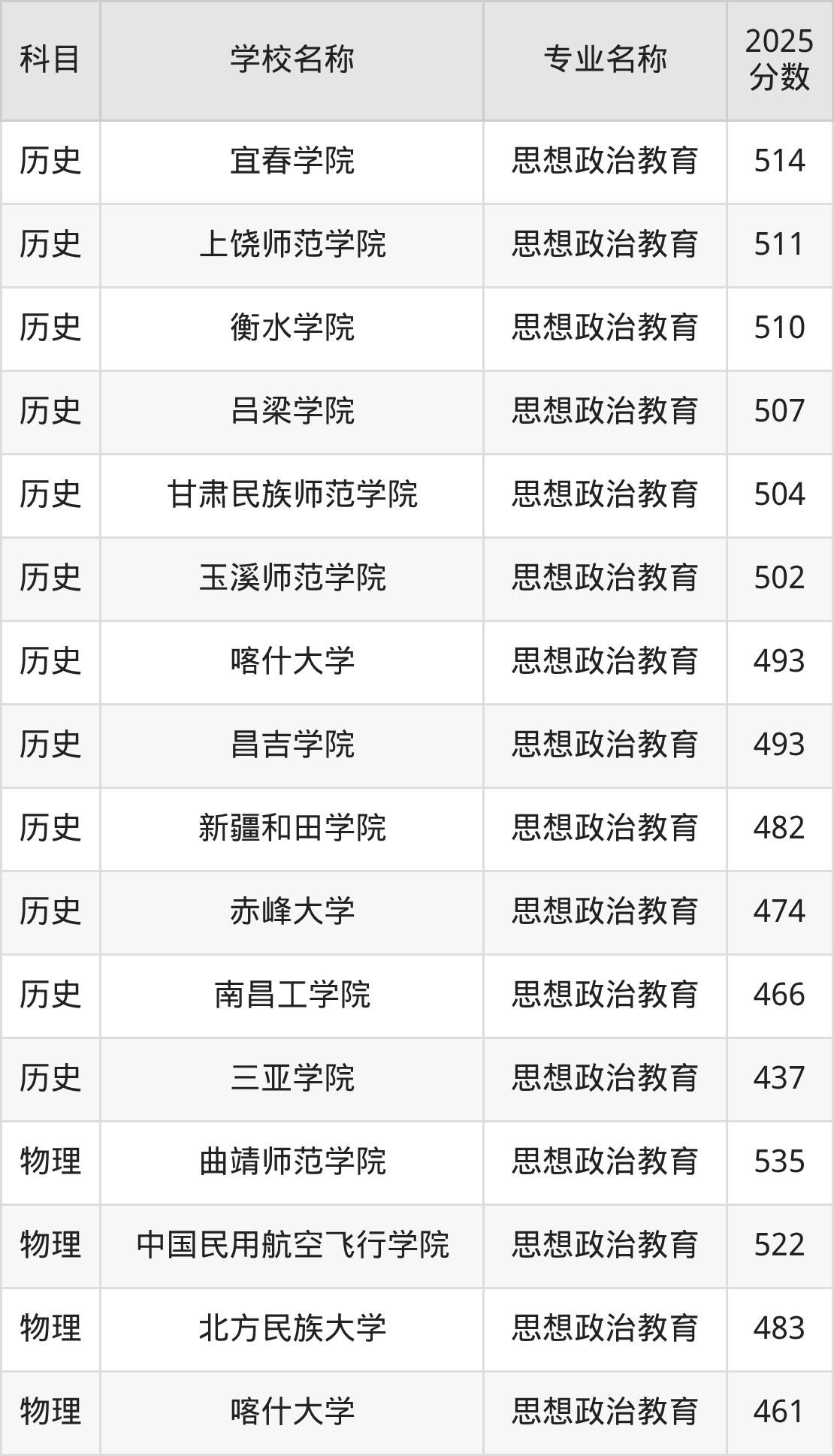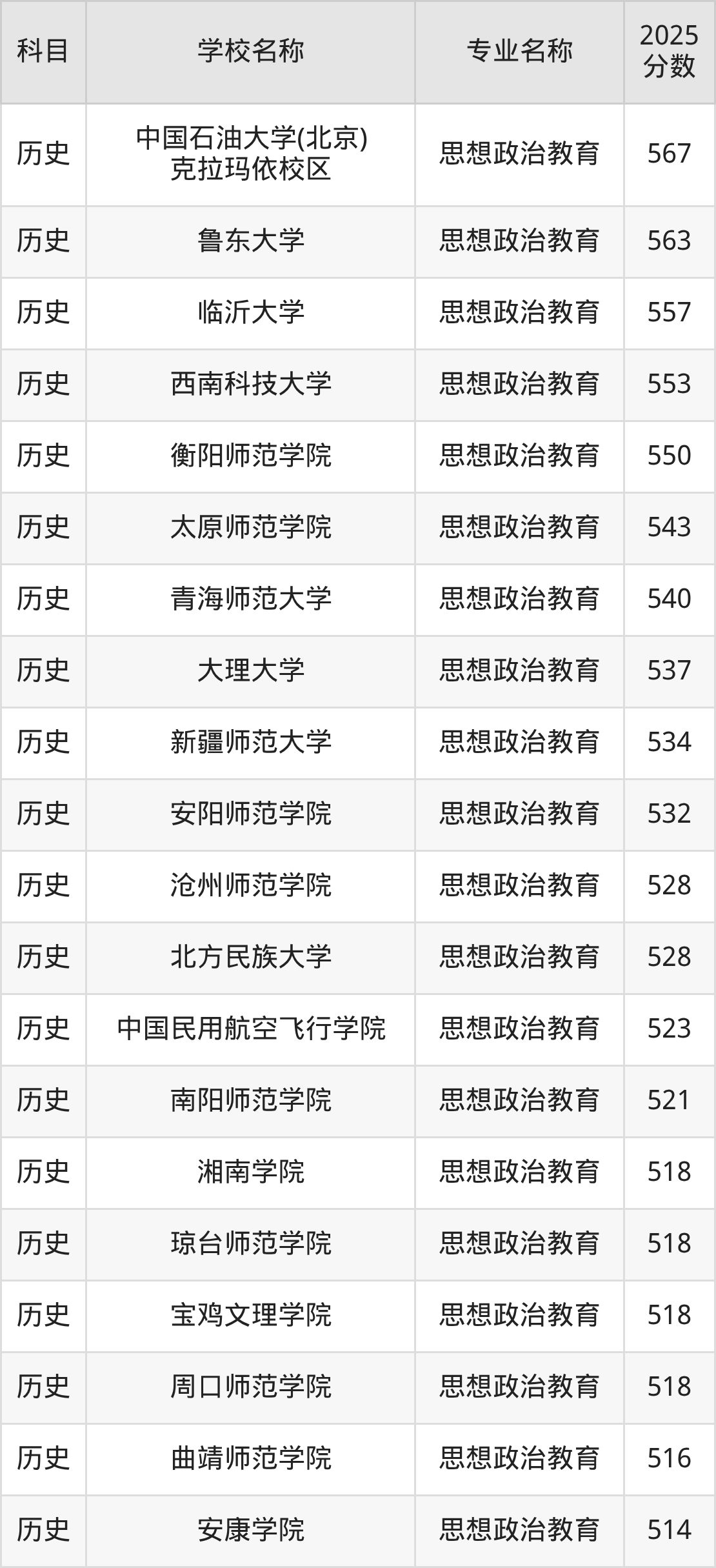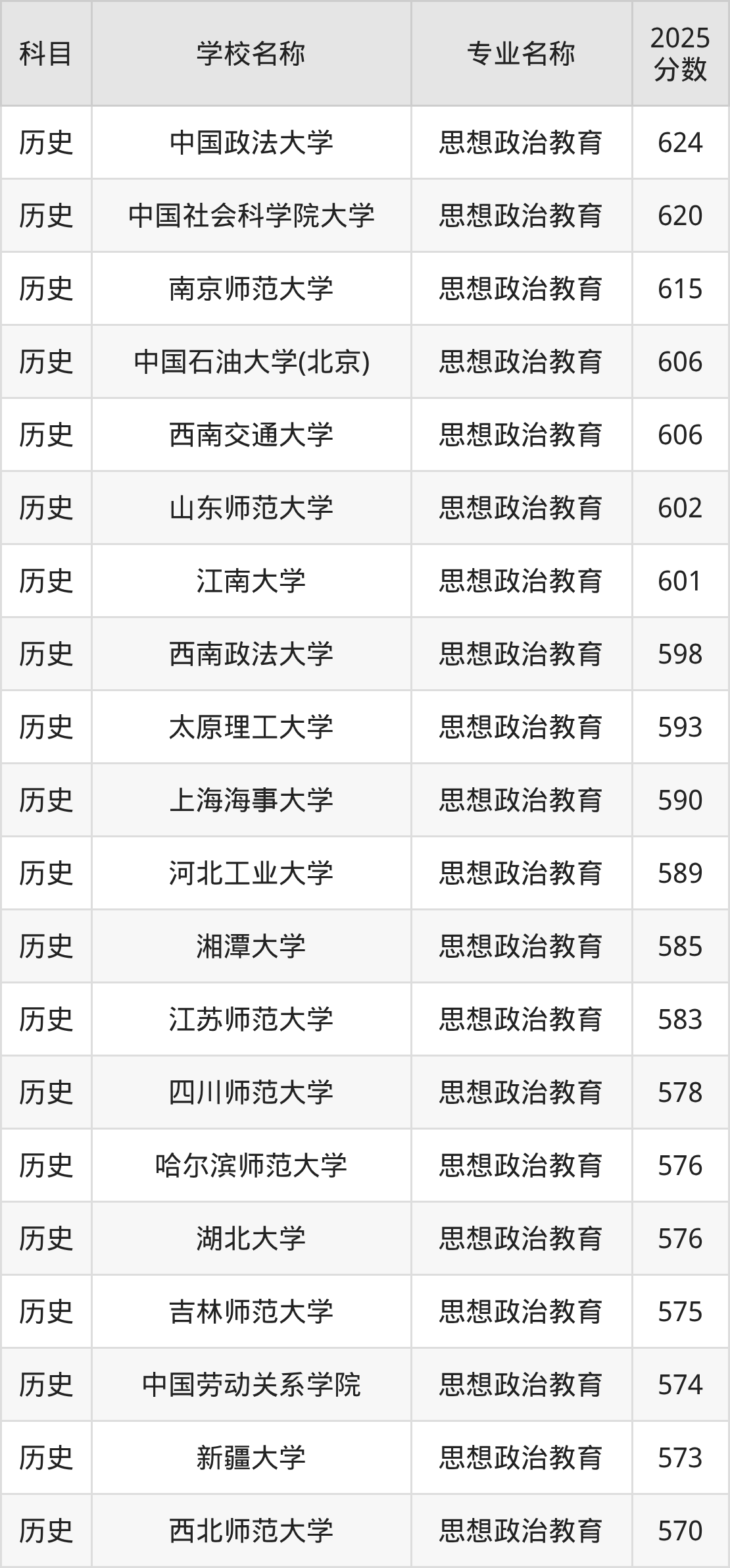 通过上文大家可以知晓,在辽宁省内招思想政治教育专业的院校数量较少,所以下文将为2026届高考生继续展示:省外大学的思想政治教育专业2025年在辽宁高考的录取情况,包含中国政法大学、中国社会科学院大学、南京师范大学、中国石油大学(北京)、西南交通大学。