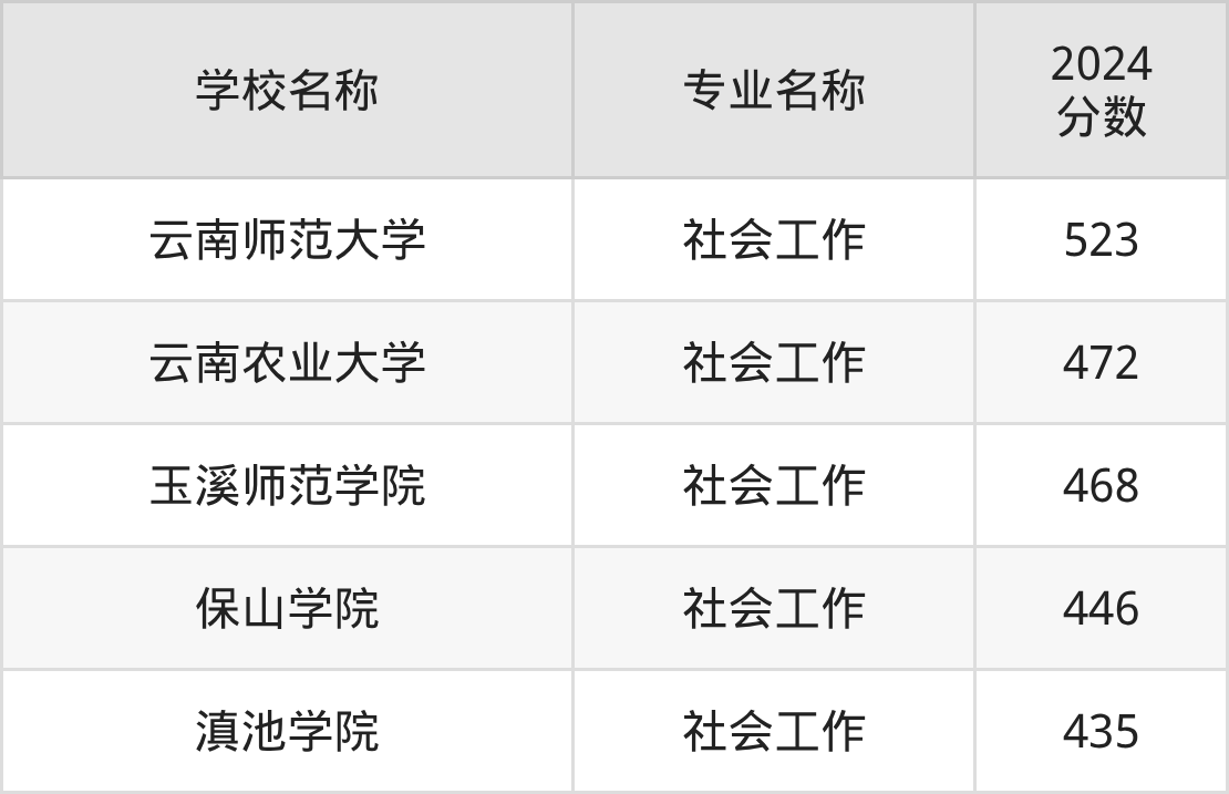 圆梦小编根据云南2024年高考文科专业分,将开设了社会工作专业且位于云南省内的大学按照“录取分”从高到低排序,得出了以上榜单。