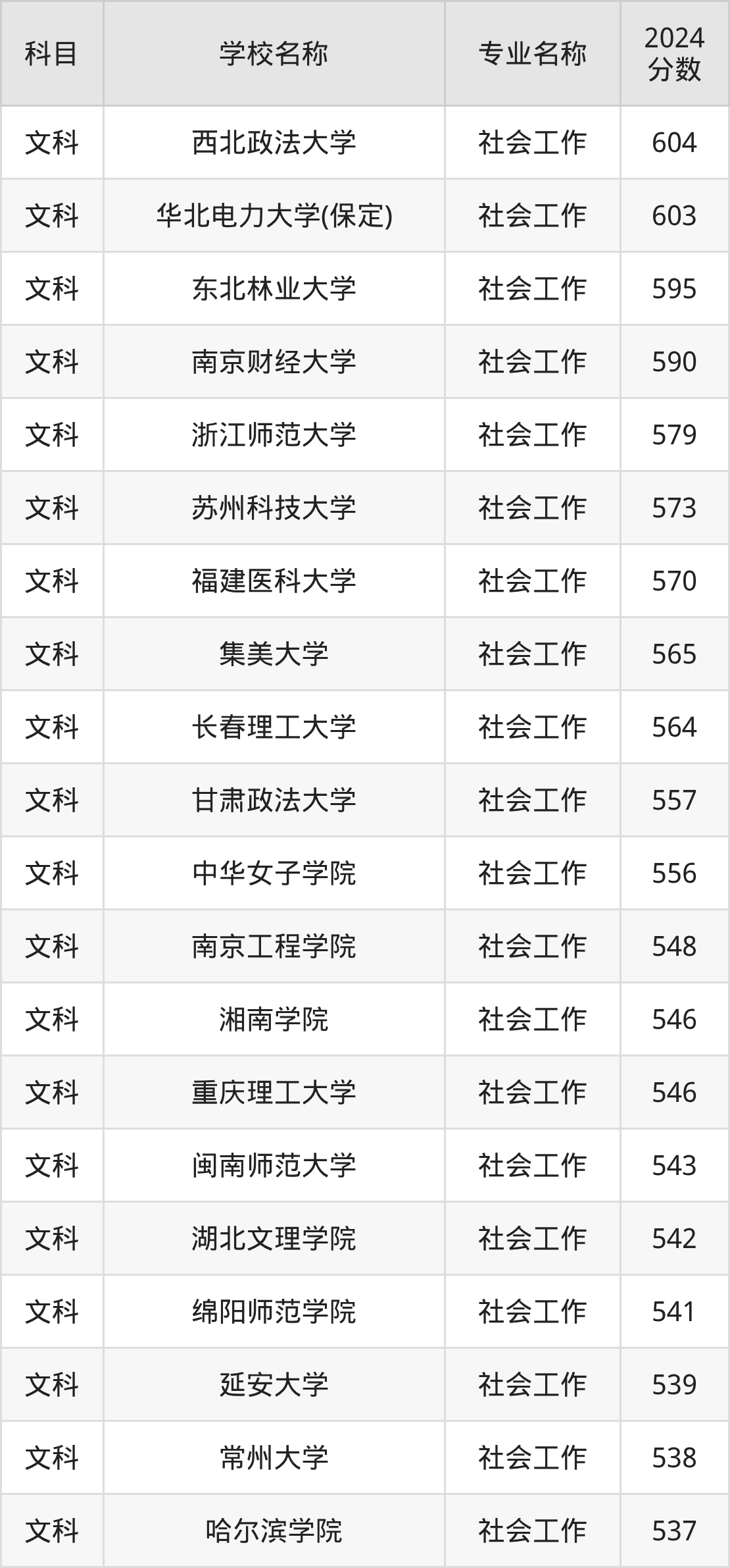 通过上文大家可以知晓,在云南省内招社会工作专业的院校数量较少,所以下文将为2026届高考生继续展示:省外大学的社会工作专业2024年在云南高考的录取情况,包含西北政法大学、华北电力大学(保定)、东北林业大学、南京财经大学、浙江师范大学。