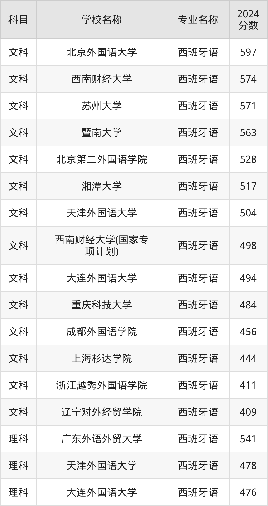 通过上文大家可以知晓,在陕西省内招西班牙语专业的院校数量较少,所以下文将为2026届高考生继续展示:省外大学的西班牙语专业2024年在陕西高考的录取情况,包含北京外国语大学、西南财经大学、苏州大学、暨南大学、北京第二外国语学院。