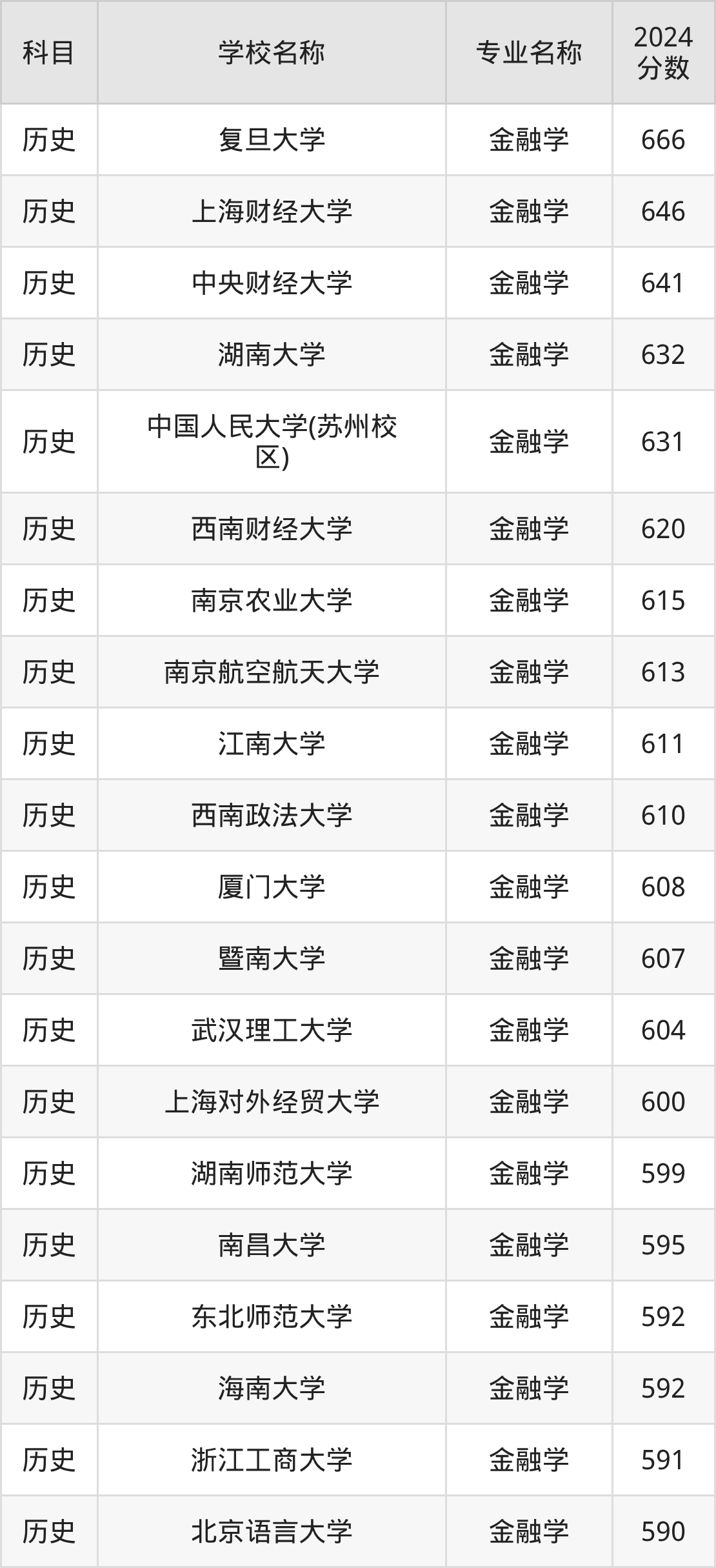 通过上文大家可以知晓,在安徽省内招金融学专业的院校数量较少,所以下文将为2026届高考生继续展示:省外大学的金融学专业2024年在安徽高考的录取情况,包含复旦大学、上海财经大学、中央财经大学、湖南大学、中国人民大学(苏州校区)。