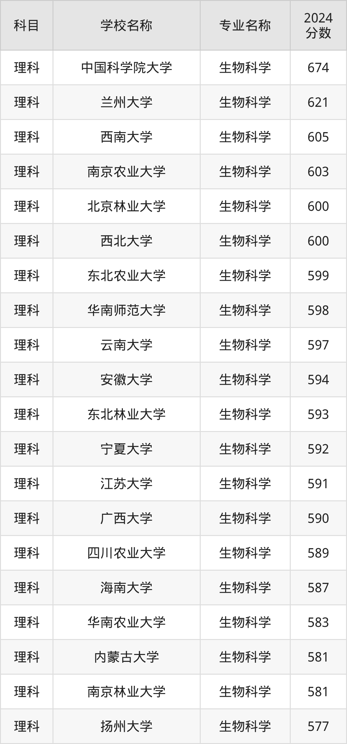 通过上文大家可以知晓,在河南省内招生物科学专业的院校数量较少,所以下文将为2026届高考生继续展示:省外大学的生物科学专业2024年在河南高考的录取情况,包含中国科学院大学、兰州大学、西南大学、南京农业大学、北京林业大学。