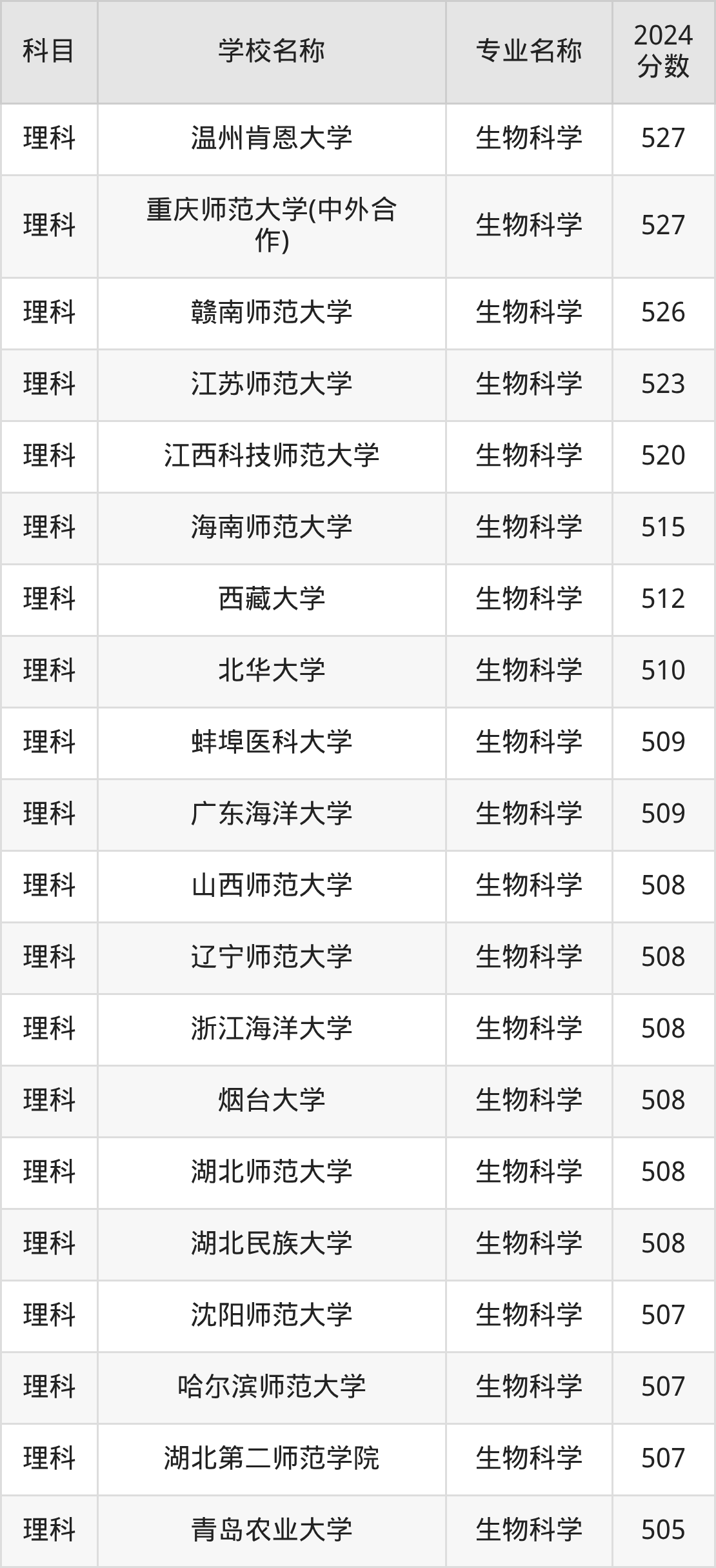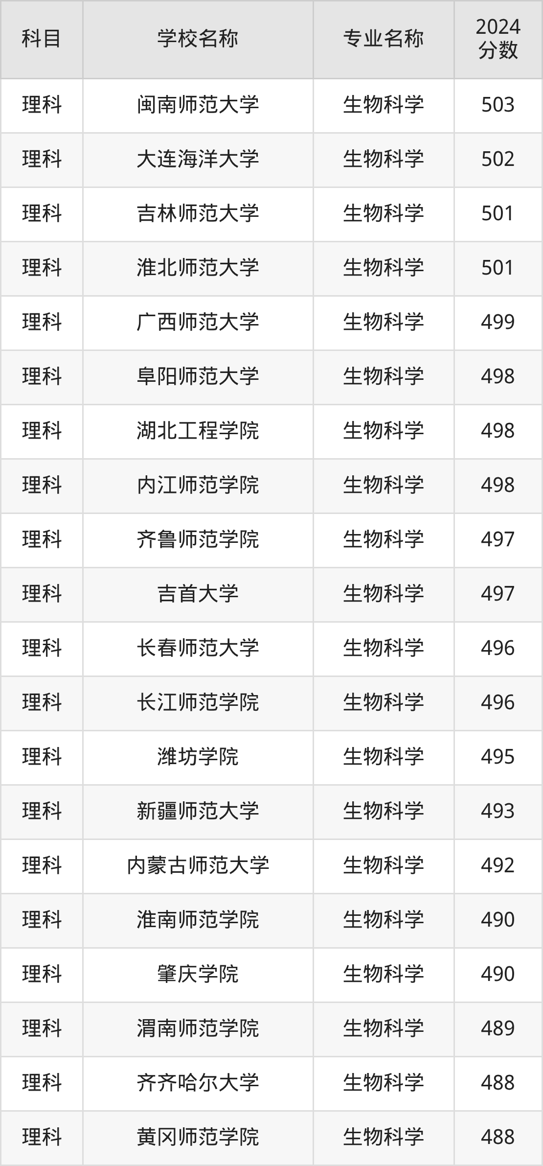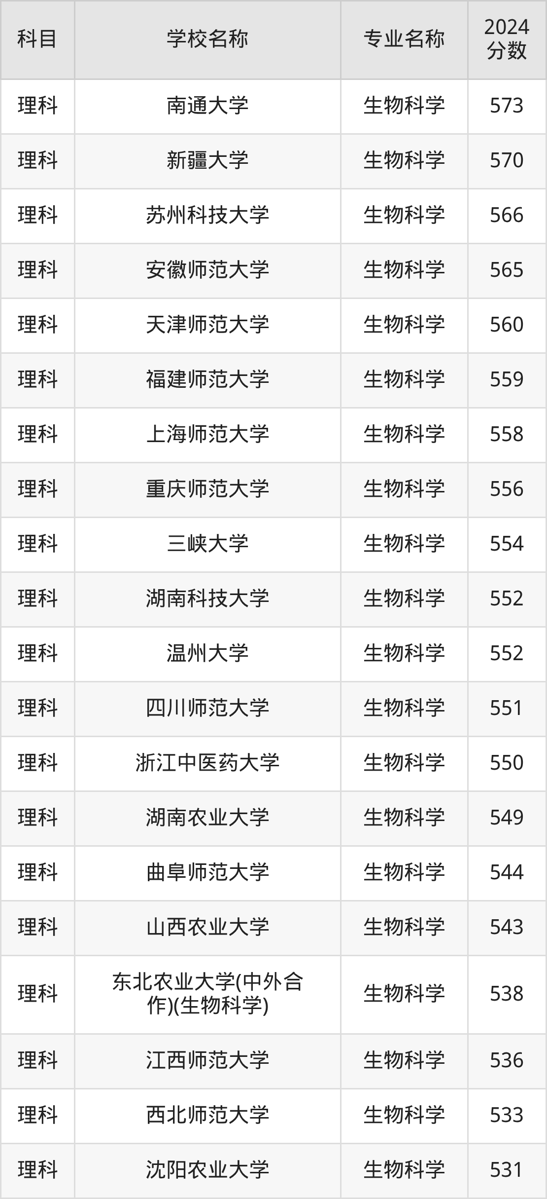 | 信阳师范大学 | 生物科学(师范) | 524 |