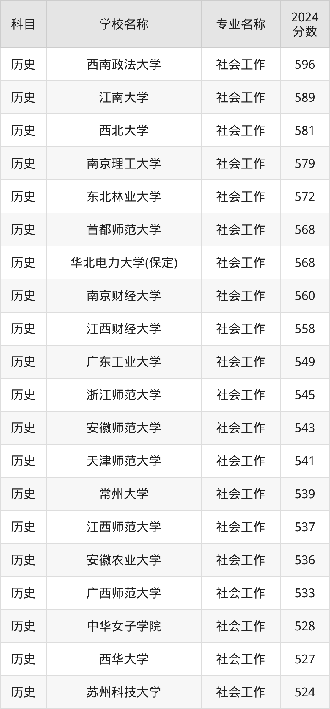 通过上文大家可以知晓,在福建省内招社会工作专业的院校数量较少,所以下文将为2026届高考生继续展示:省外大学的社会工作专业2024年在福建高考的录取情况,包含西南政法大学、江南大学、西北大学、南京理工大学、东北林业大学。
