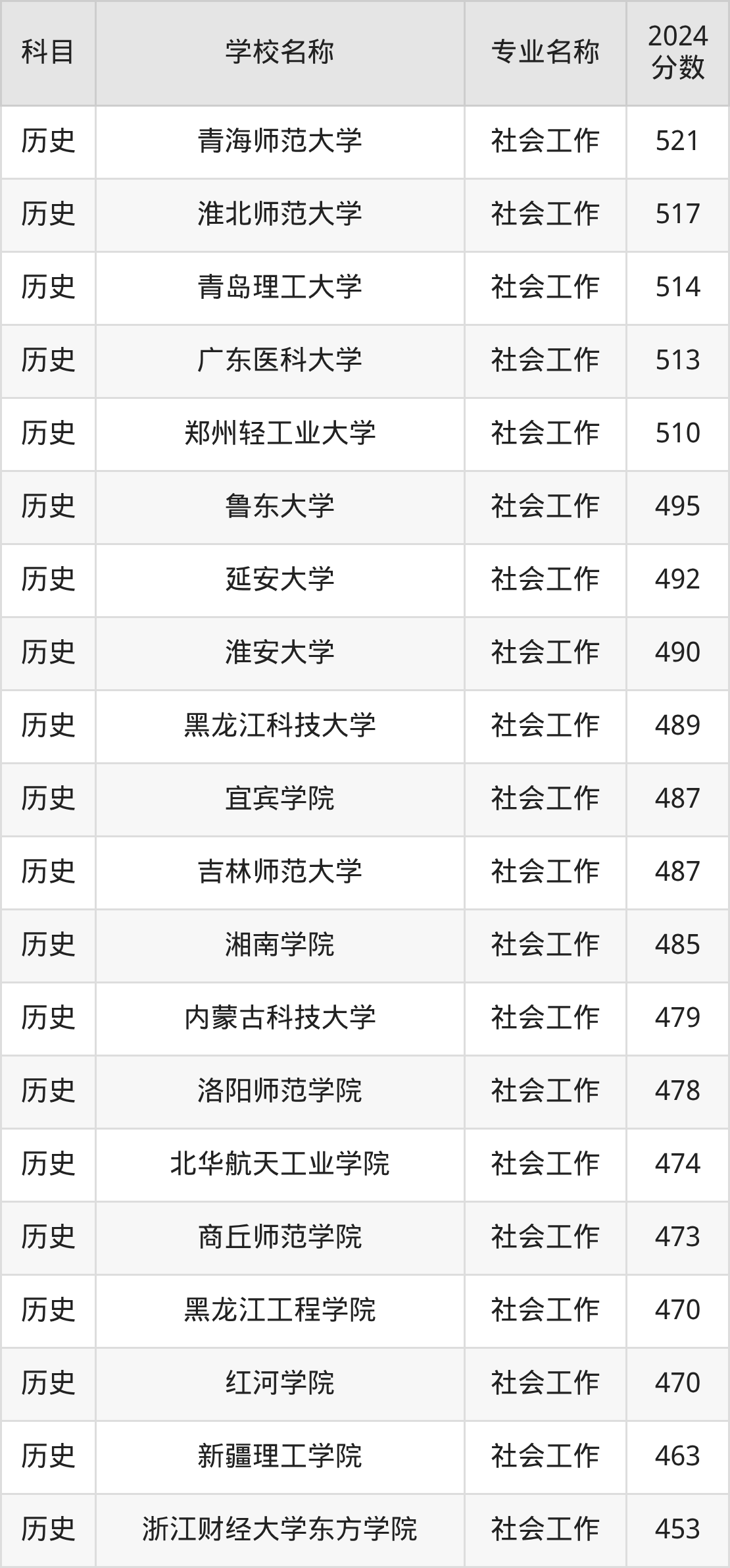 | 闽江大学(面向福州) | 社会工作 | 510 |