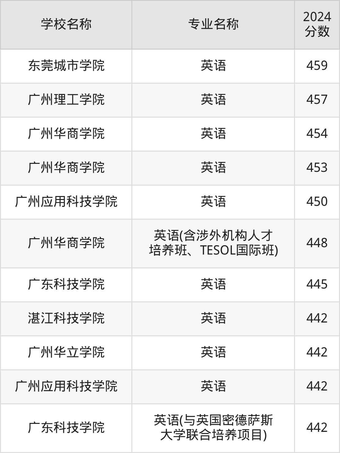 | 广东白云学院 | 英语 | 459 |