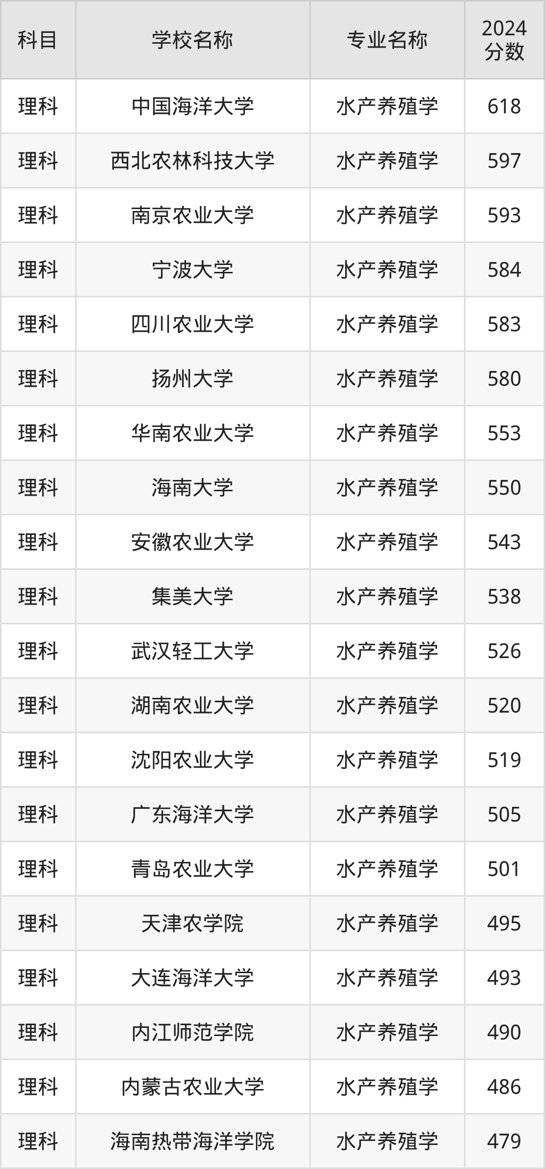 通过上文大家可以知晓,在河南省内招水产养殖学专业的院校数量较少,所以下文将为2026届高考生继续展示:省外大学的水产养殖学专业2024年在河南高考的录取情况,包含中国海洋大学、西北农林科技大学、南京农业大学、宁波大学、四川农业大学。