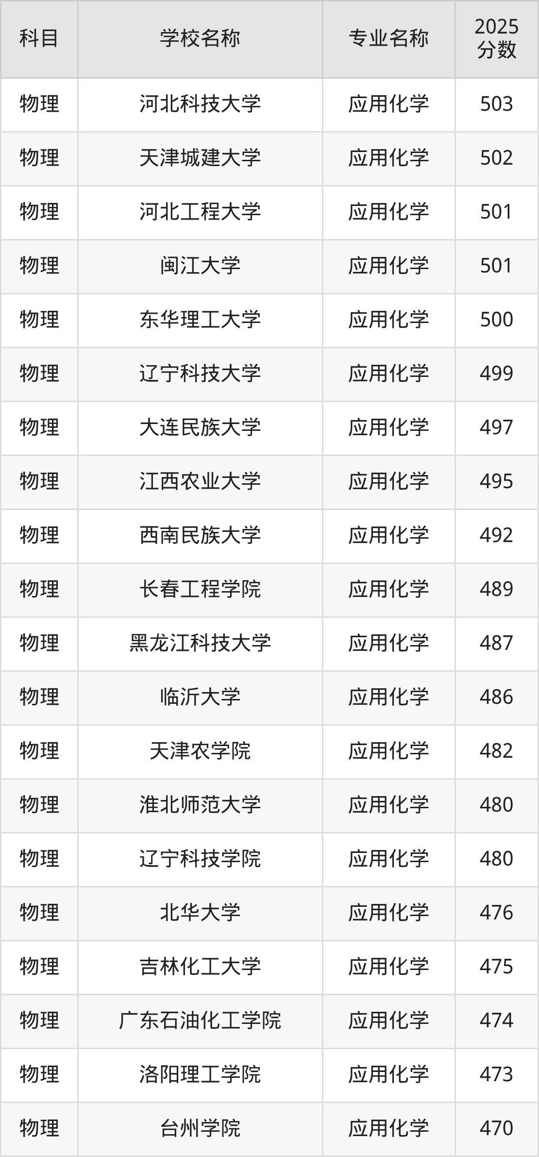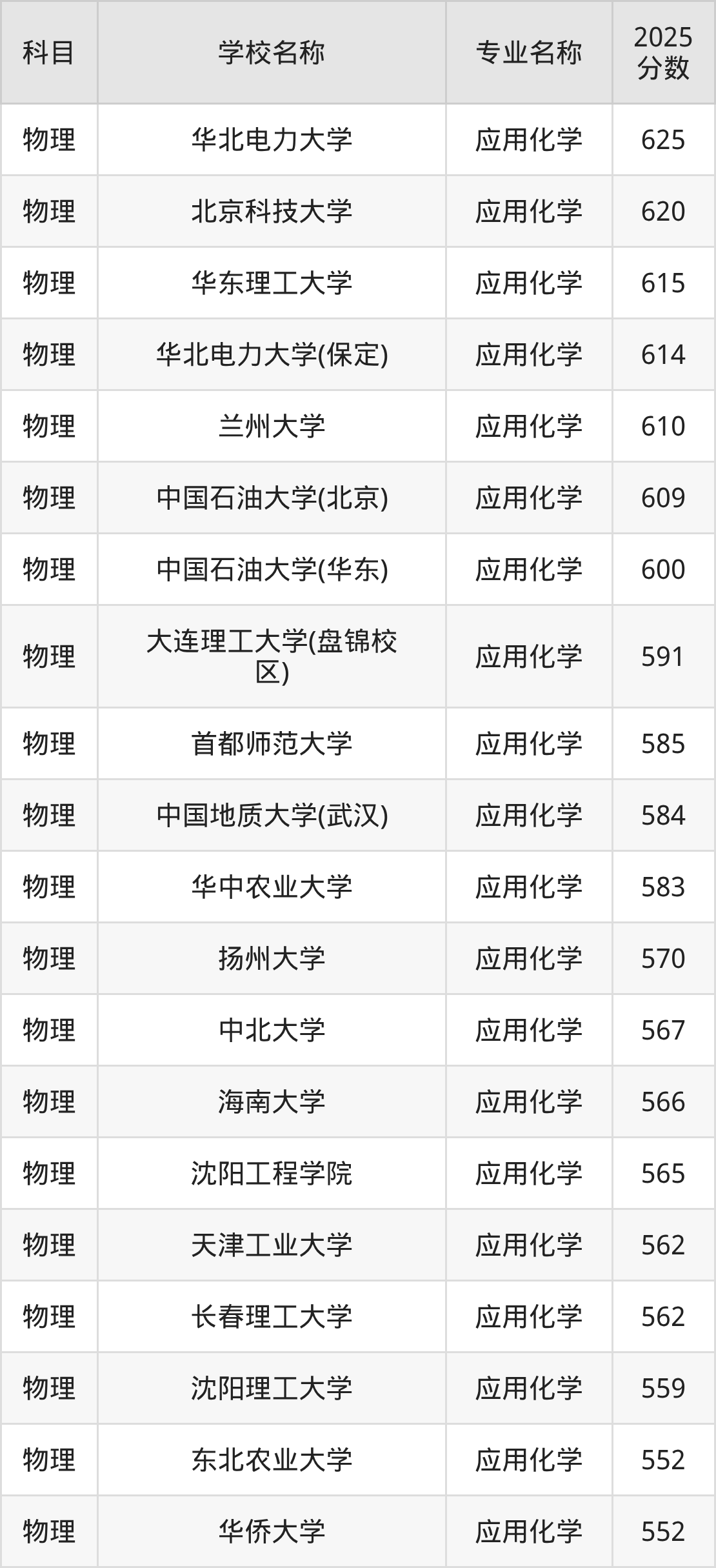 通过上文大家可以知晓,在内蒙古自治区内招应用化学专业的院校数量较少,所以下文将为2026届高考生继续展示:自治区外大学的应用化学专业2025年在内蒙古高考的录取情况,包含华北电力大学、北京科技大学、华东理工大学、华北电力大学(保定)、兰州大学。