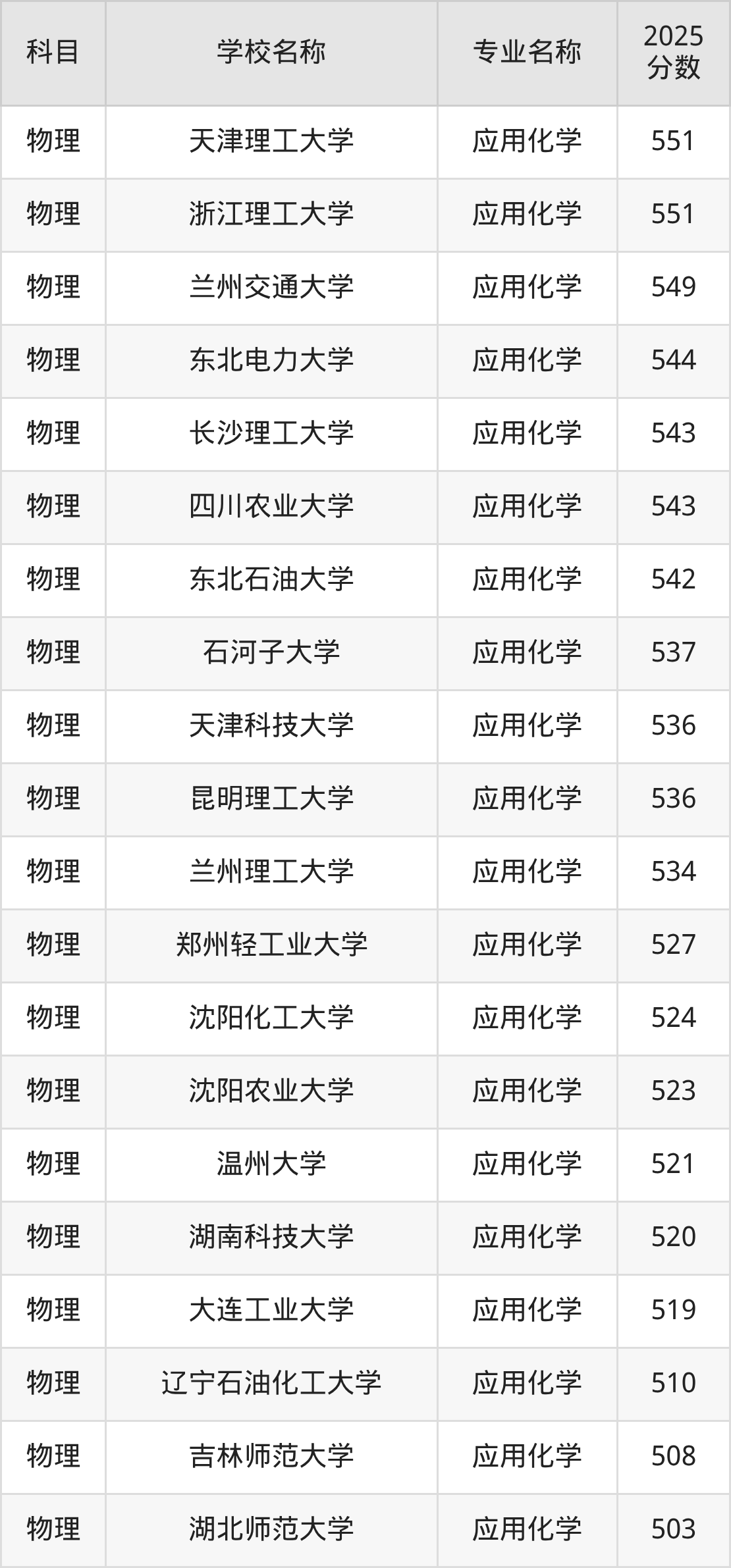 在直接以“应用化学”的名称招生的内蒙古自治区大学中,内蒙古大学的分数线最高、排名第一名,在物理组的最低分是561分,全自治区排名前13809位的高考生才有较大机会被录取。
