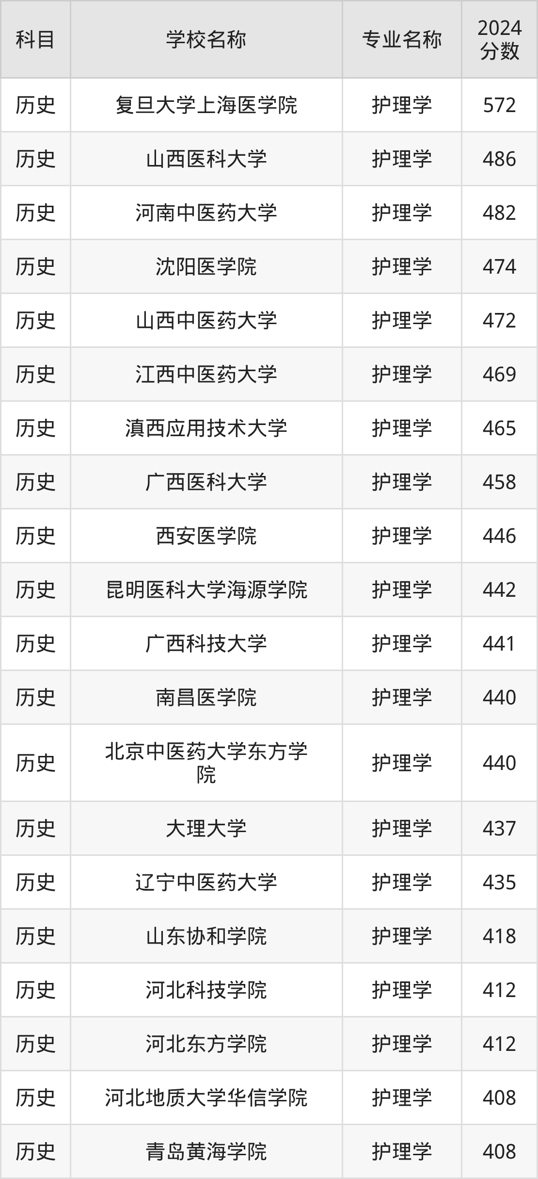 通过上文大家可以知晓,在黑龙江省内招护理学专业的院校数量较少,所以下文将为2026届高考生继续展示:省外大学的护理学专业2024年在黑龙江高考的录取情况,包含复旦大学上海医学院、山西医科大学、河南中医药大学、沈阳医学院、山西中医药大学。