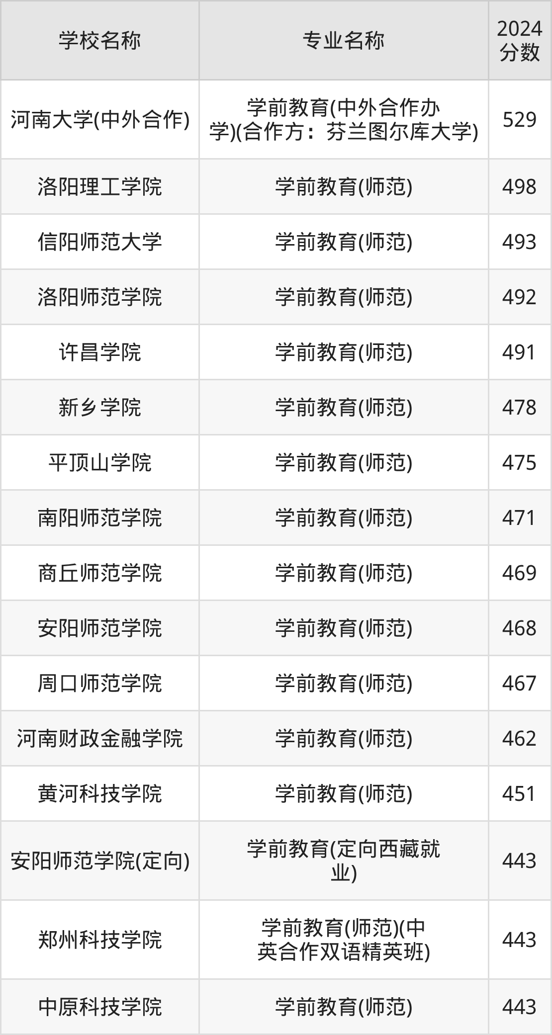 在直接以“学前教育”的名称招生的河南省大学中,河南大学(中外合作)的分数线最高、排名第一名,在文科的最低分是524分,全省排名前24082位的高考生才有较大机会被录取。