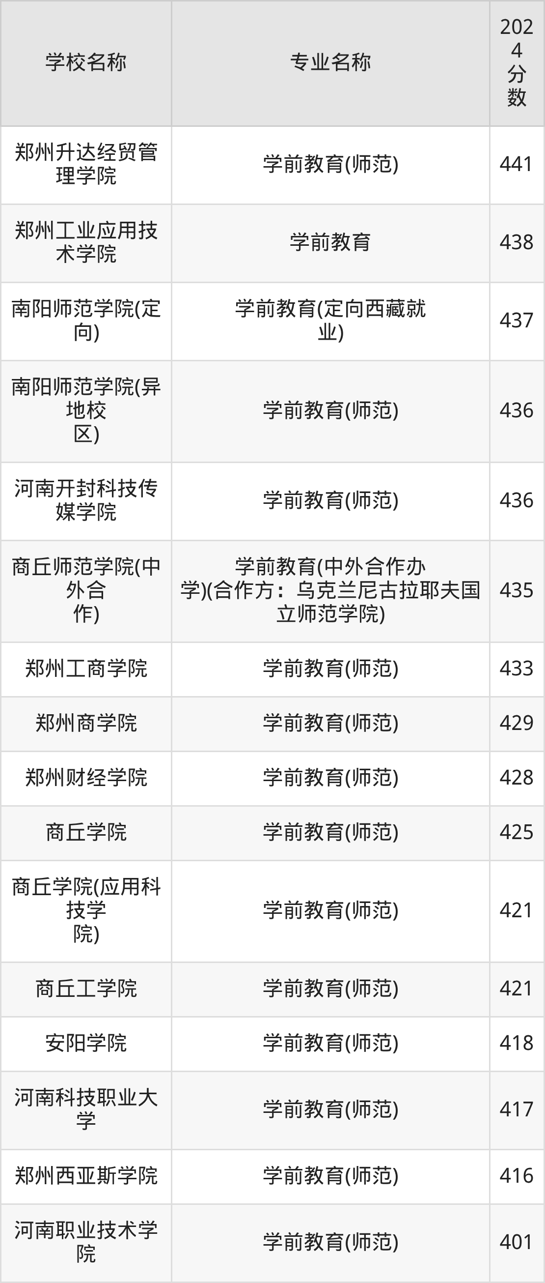 | 郑州商学院 | 学前教育(师范) | 457 |