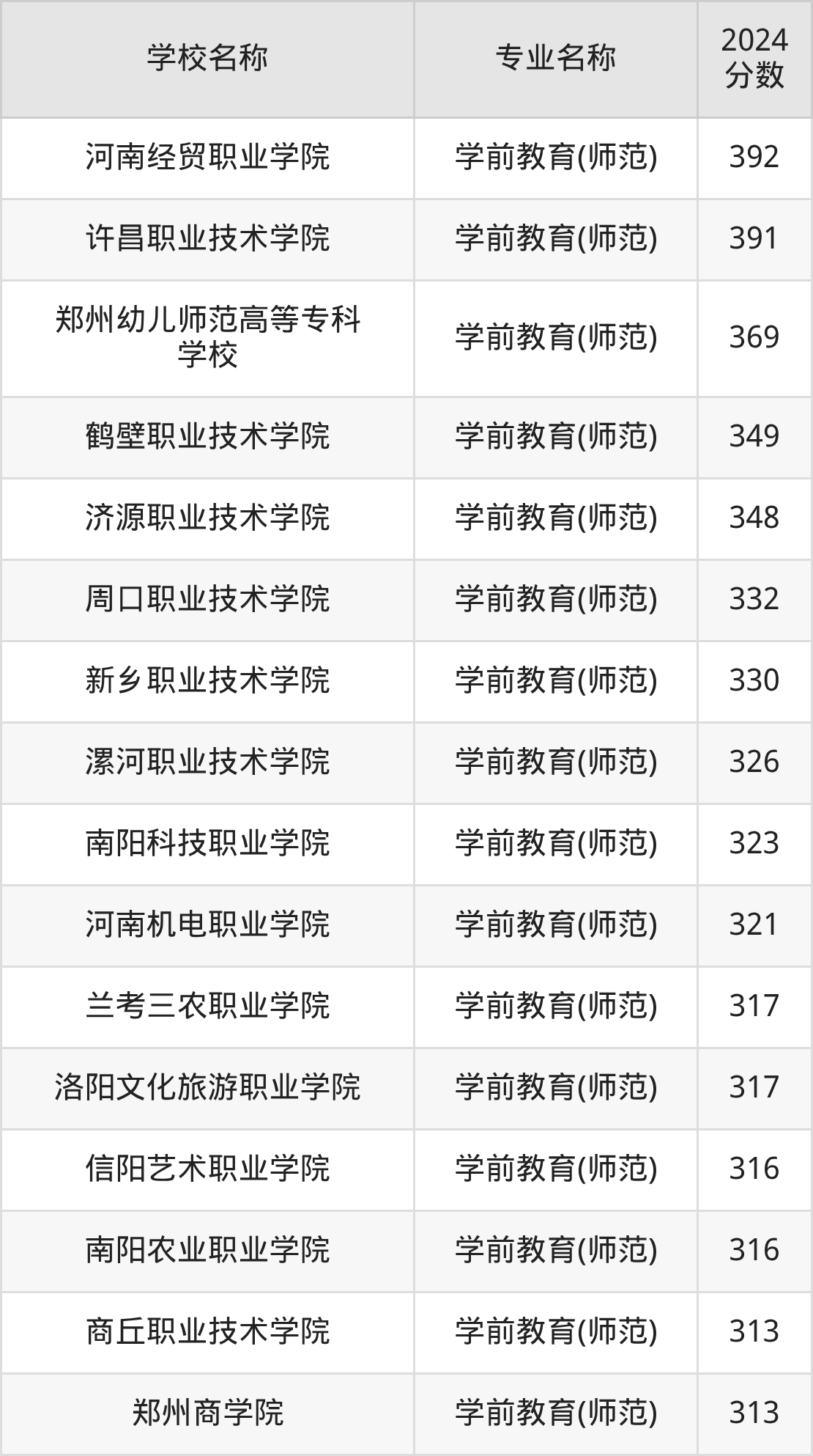 | 许昌职业技术学院 | 学前教育(师范) | 392 |
