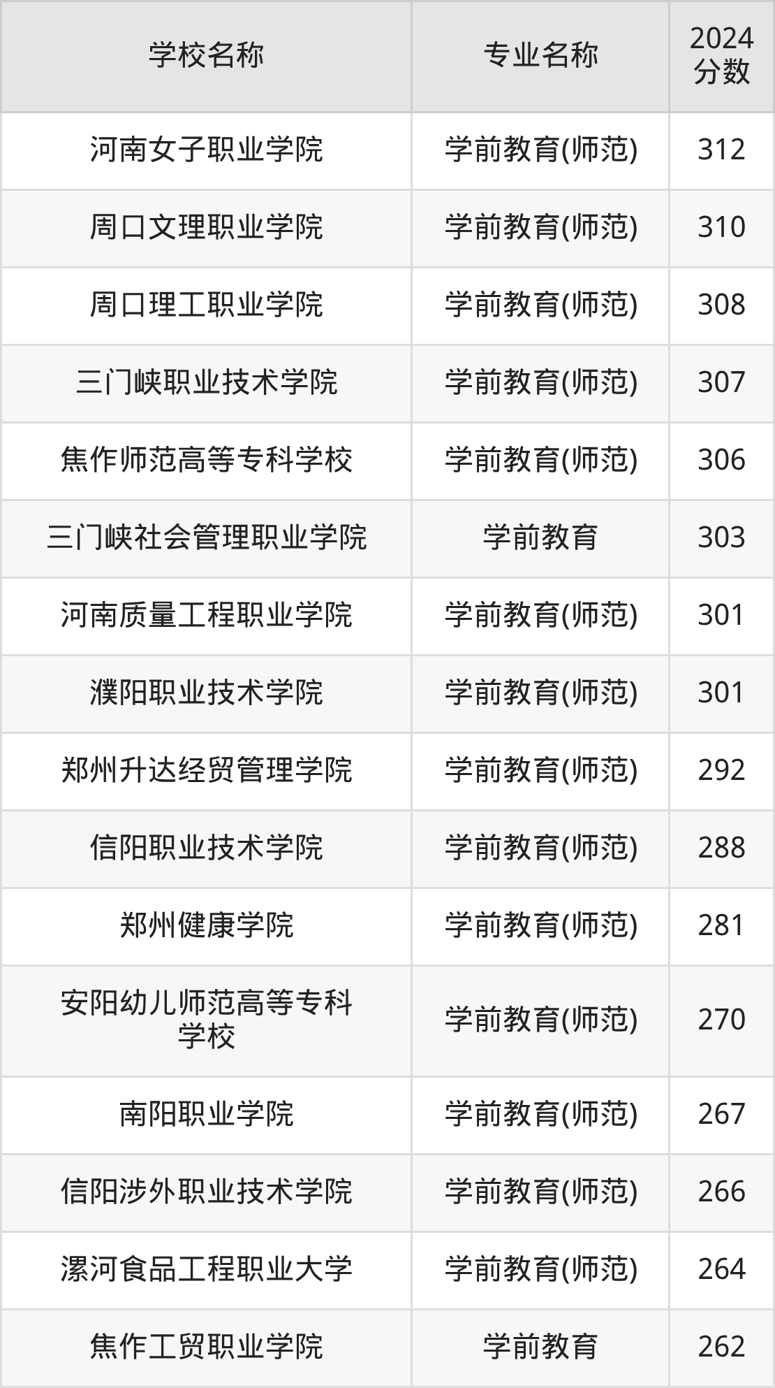 | 河南女子职业学院 | 学前教育(师范) | 301 |