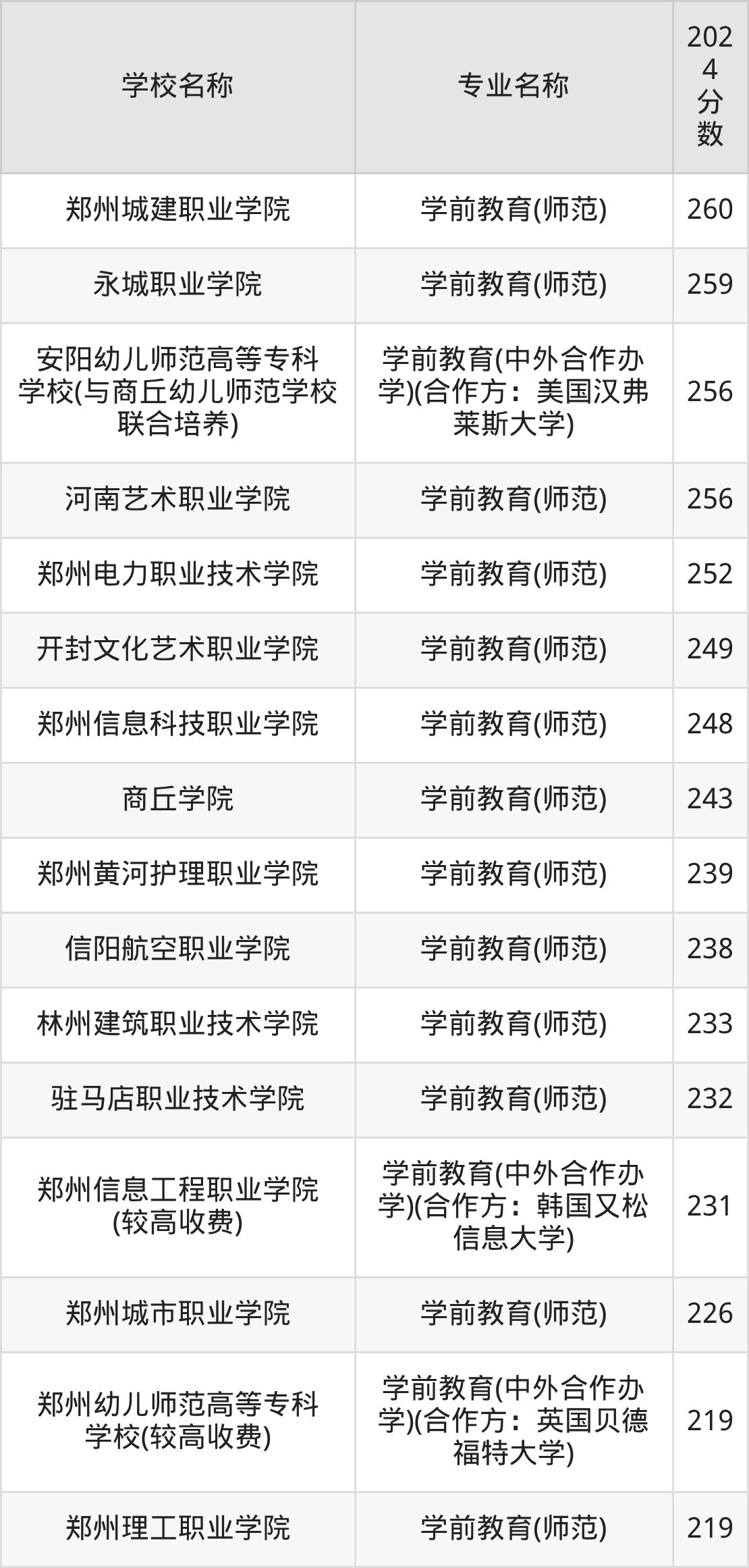 | 郑州信息工程职业学院 (较高收费) | 学前教育(中外 合作办学)(合 作方:韩国又松 信息大学) | 210 |