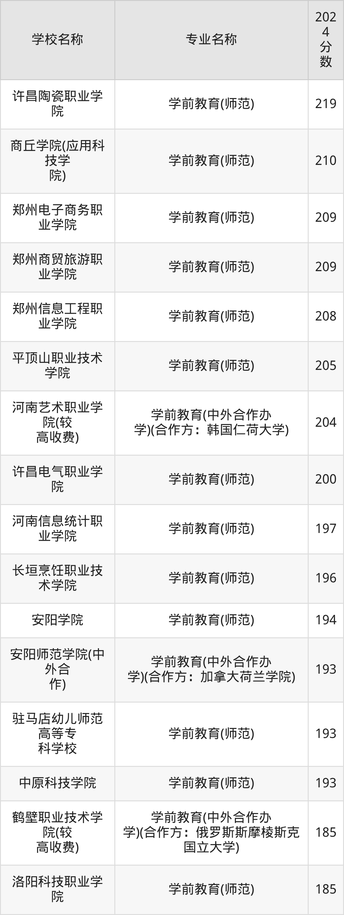 | 安阳师范学院(中外合 作) | 学前教育(中外 合作办学)(合 作方:加拿大荷 兰学院) | 193 |