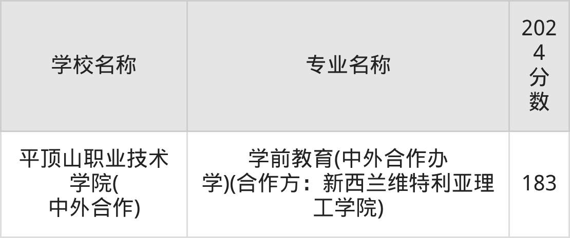 | 平顶山职业技术学院( 中外合作) | 学前教育(中外 合作办学)(合 作方:新西兰维 特利亚理工学院) | 186 |