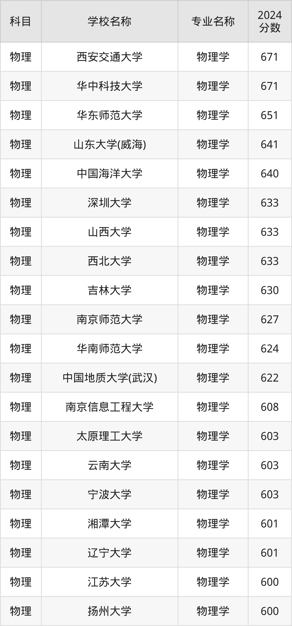 通过上文大家可以知晓,在安徽省内招物理学专业的院校数量较少,所以下文将为2026届高考生继续展示:省外大学的物理学专业2024年在安徽高考的录取情况,包含西安交通大学、华中科技大学、华东师范大学、山东大学(威海)、中国海洋大学。