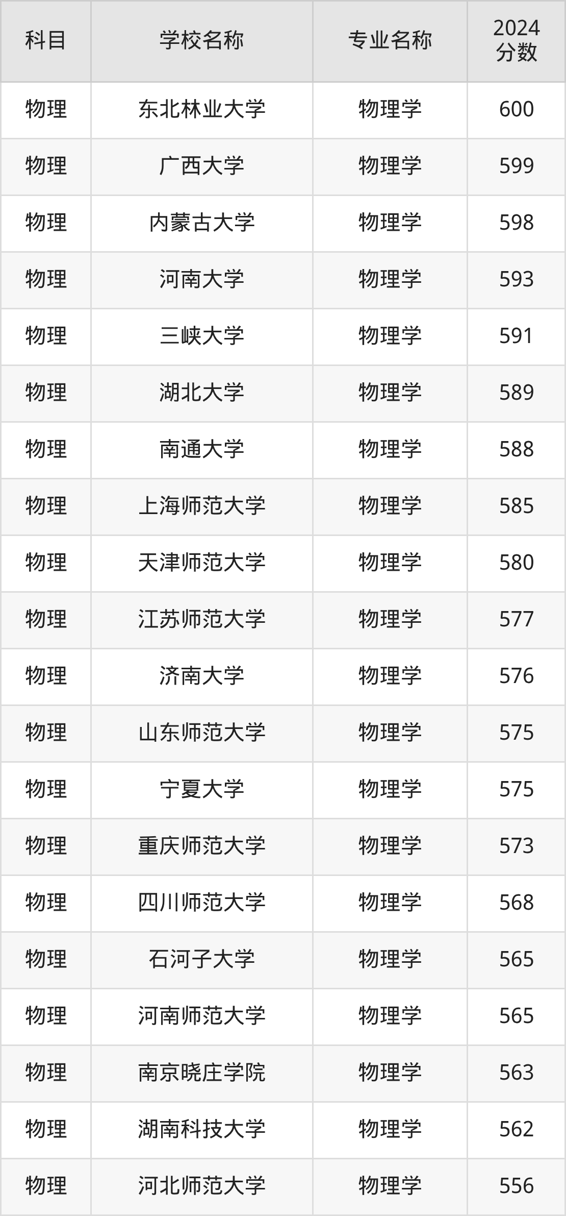 | 安徽师范大学 | 物理学(师范) | 578 |