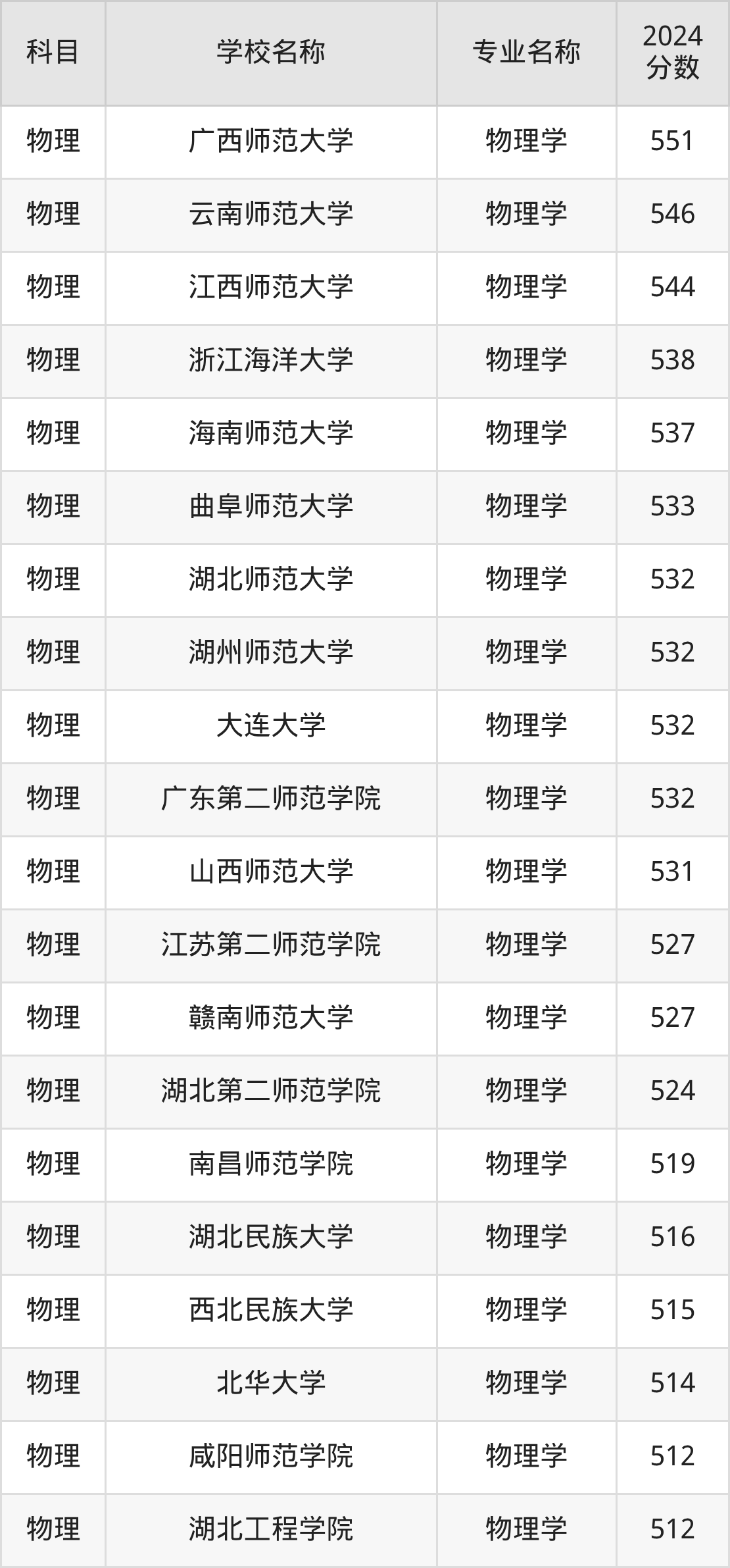 | 淮北师范大学 | 物理学(师范) | 522 |