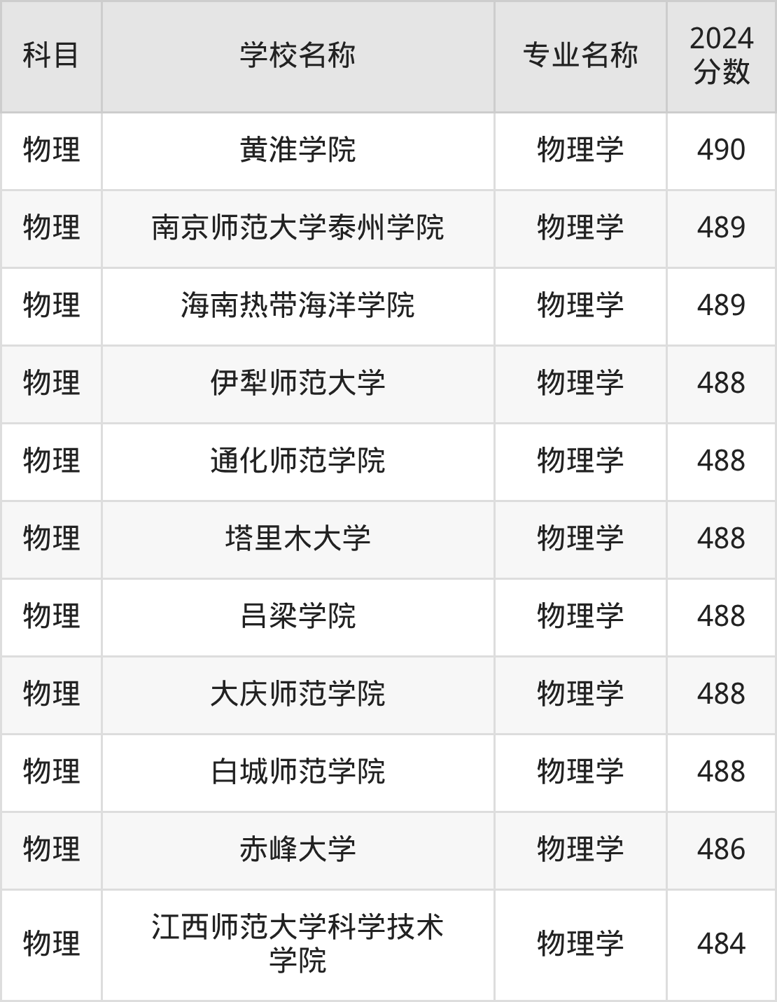 | 淮南师范学院 | 物理学(师范) | 502 |