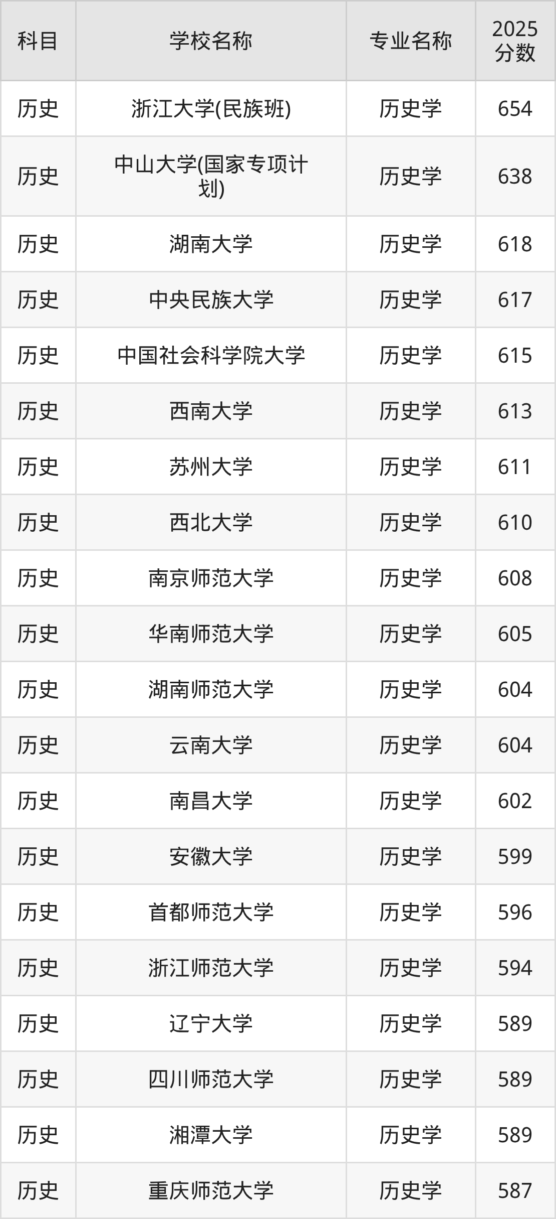 通过上文大家可以知晓,在贵州省内招历史学专业的院校数量较少,所以下文将为2026届高考生继续展示:省外大学的历史学专业2025年在贵州高考的录取情况,包含浙江大学(民族班)、中山大学(国家专项计划)、湖南大学、中央民族大学、中国社会科学院大学。