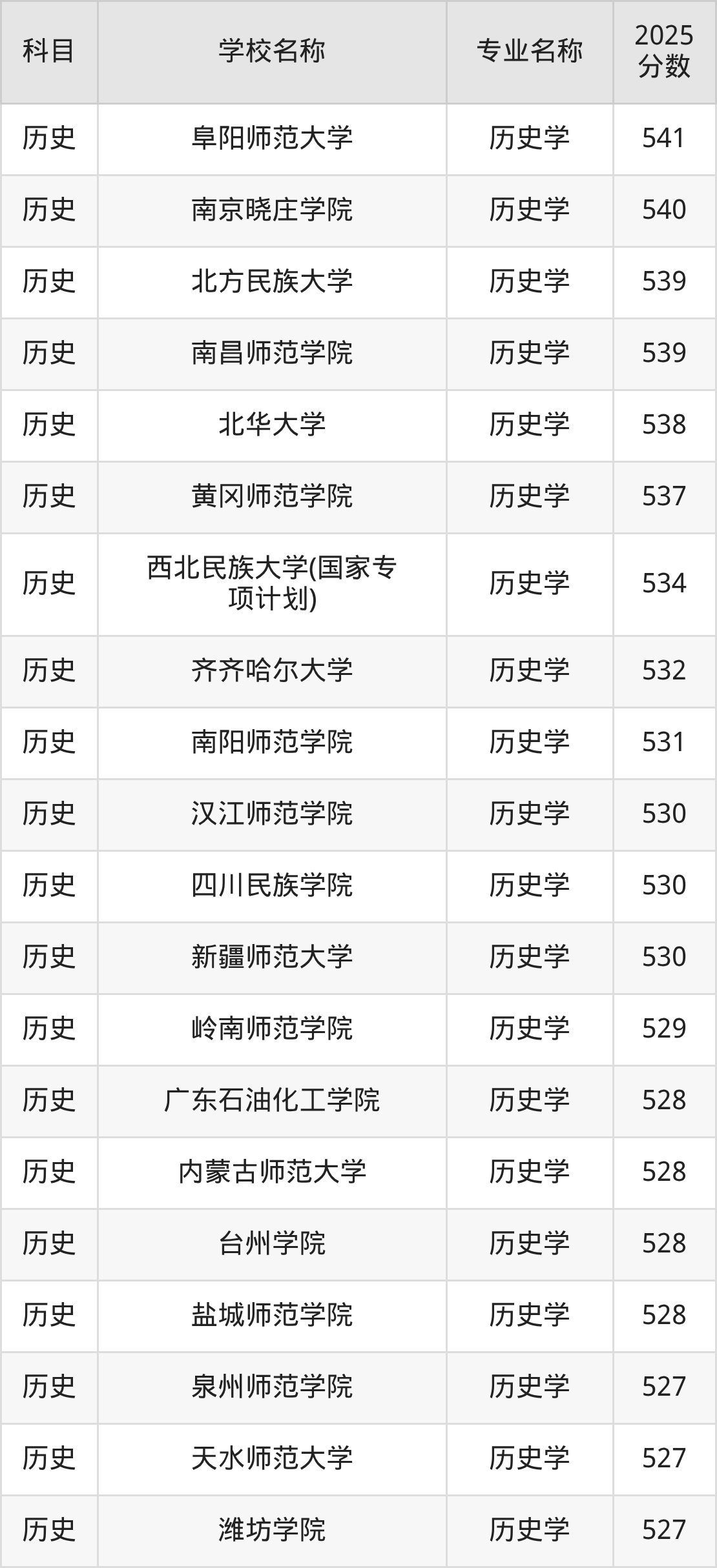 | 遵义师范学院 | 历史学(师范类) | 531 |