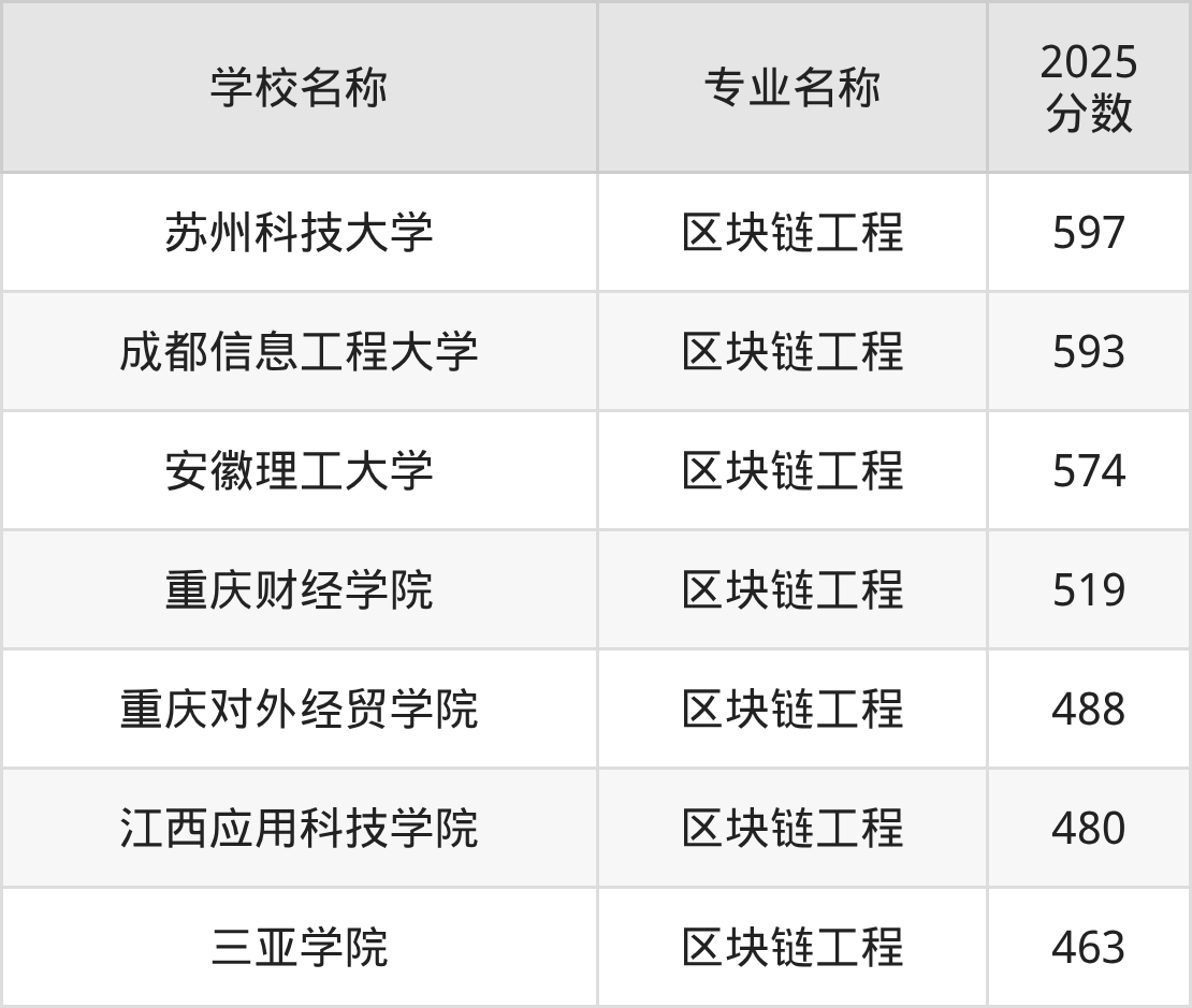 通过上文大家可以知晓,在浙江省内招区块链工程专业的院校数量较少,所以下文将为2026届高考生继续展示:省外大学的区块链工程专业2025年在浙江高考的录取情况,包含苏州科技大学、成都信息工程大学、安徽理工大学、重庆财经学院、重庆对外经贸学院。