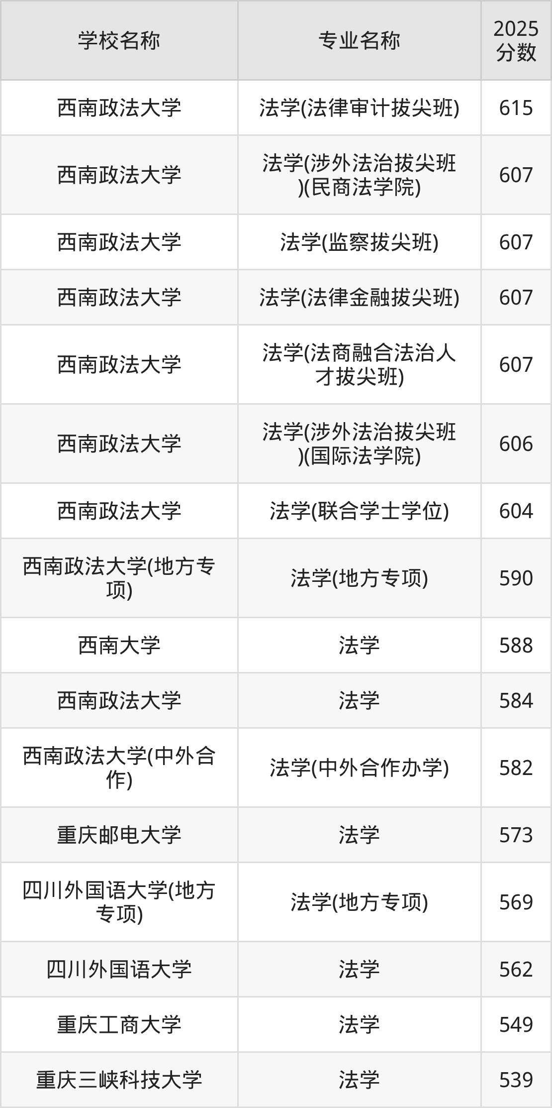 | 西南政法大学 | 法学(法律金融 拔尖班) | 605 |