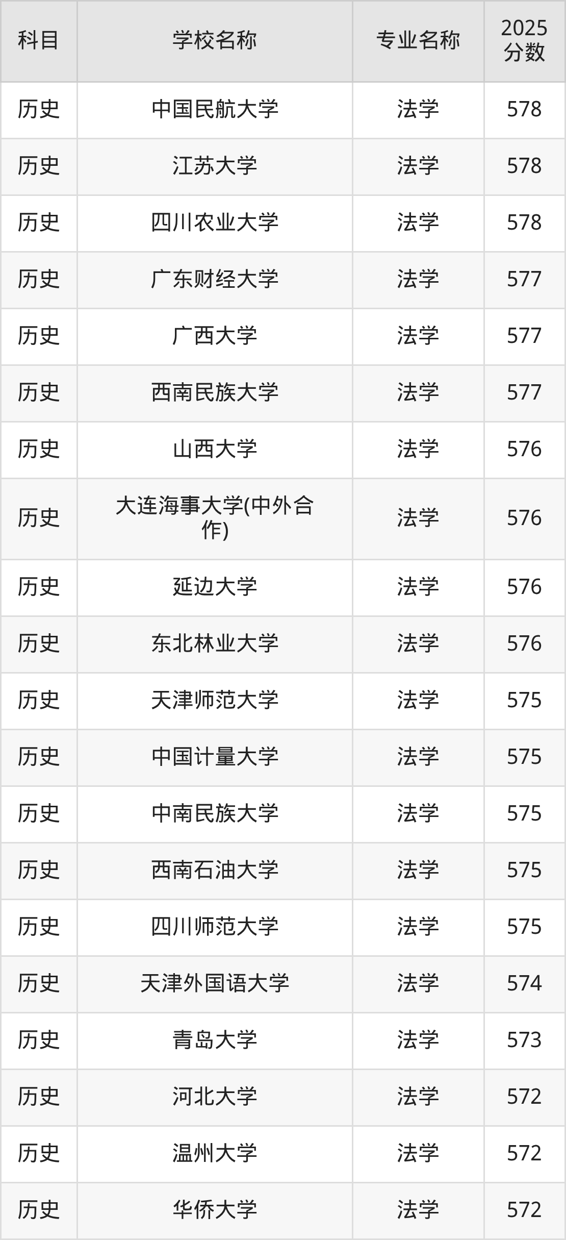 | 西南政法大学 | 法学 | 578 |