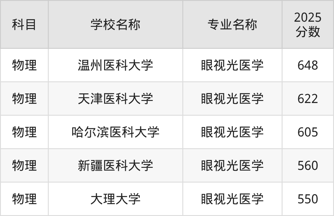 通过上文大家可以知晓,在辽宁省内招眼视光医学专业的院校数量较少,所以下文将为2026届高考生继续展示:省外大学的眼视光医学专业2025年在辽宁高考的录取情况,包含温州医科大学、天津医科大学、哈尔滨医科大学、新疆医科大学、大理大学。