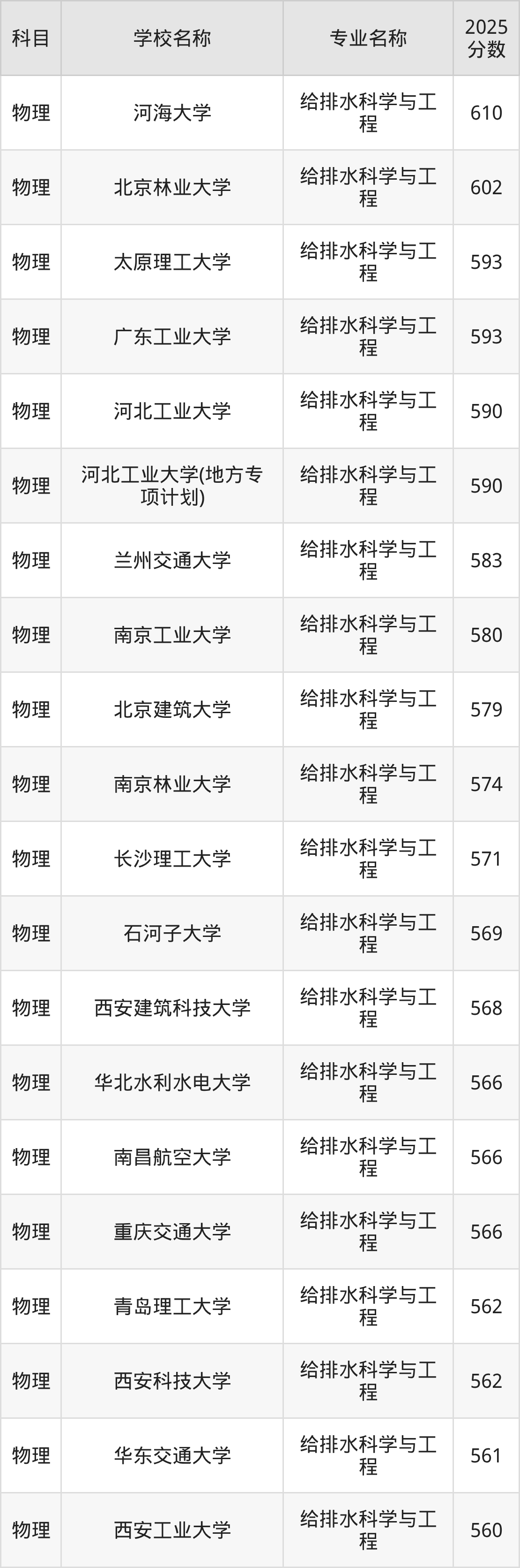 通过上文大家可以知晓,在河北省内招给排水科学与工程专业的院校数量较少,所以下文将为2026届高考生继续展示:省外大学的给排水科学与工程专业2025年在河北高考的录取情况,包含河海大学、北京林业大学、太原理工大学、广东工业大学、河北工业大学。