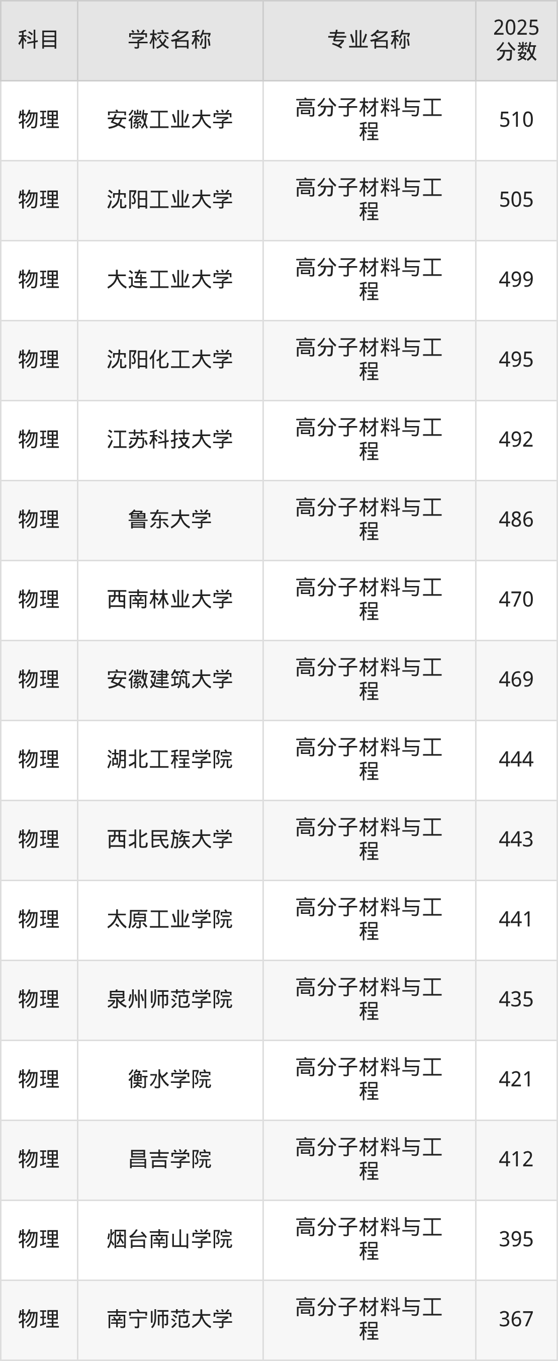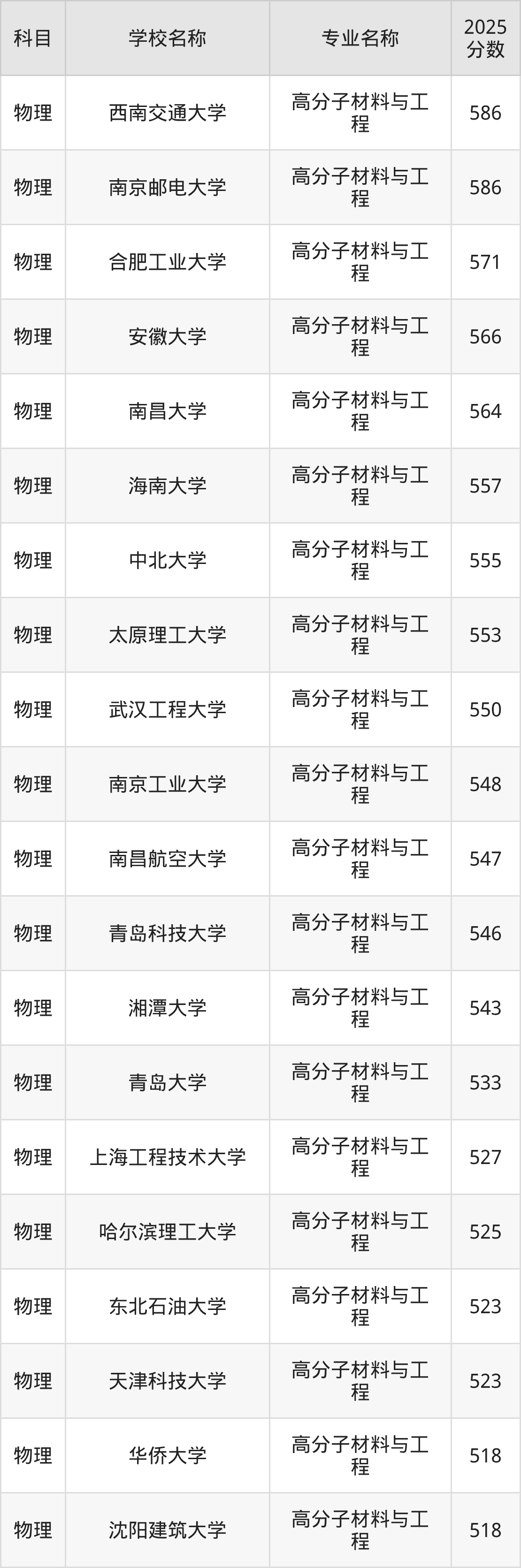 通过上文大家可以知晓,在吉林省内招高分子材料与工程专业的院校数量较少,所以下文将为2026届高考生继续展示:省外大学的高分子材料与工程专业2025年在吉林高考的录取情况,包含西南交通大学、南京邮电大学、合肥工业大学、安徽大学、南昌大学。
