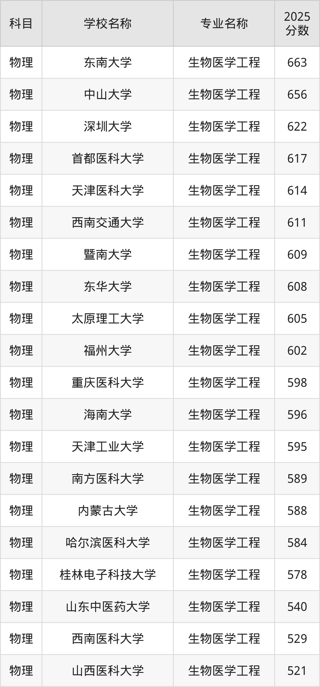通过上文大家可以知晓,在辽宁省内招生物医学工程专业的院校数量较少,所以下文将为2026届高考生继续展示:省外大学的生物医学工程专业2025年在辽宁高考的录取情况,包含东南大学、中山大学、深圳大学、首都医科大学、天津医科大学。