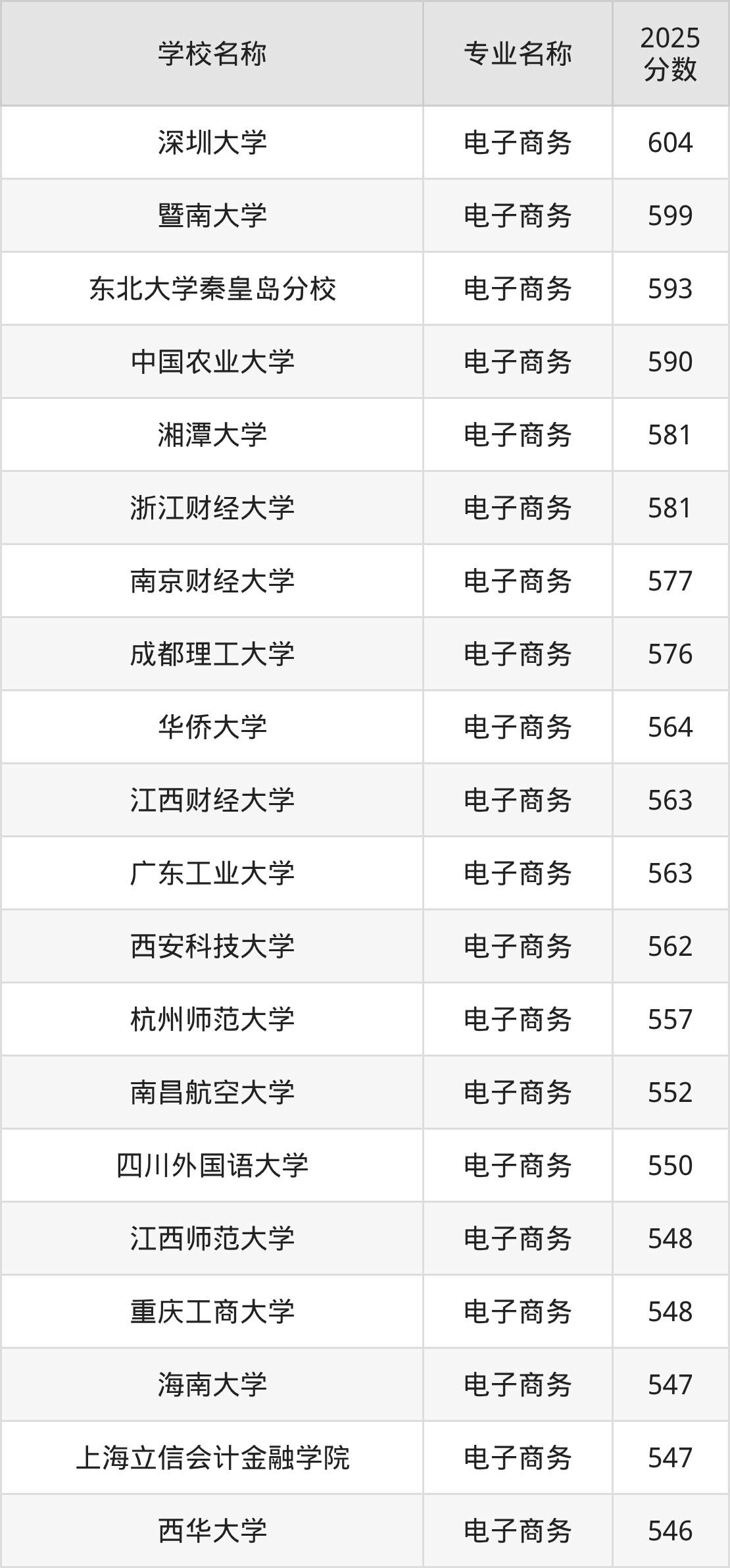 通过上文大家可以知晓,在山东省内招电子商务专业的院校数量较少,所以下文将为2026届高考生继续展示:省外大学的电子商务专业2025年在山东高考的录取情况,包含深圳大学、暨南大学、东北大学秦皇岛分校、中国农业大学、湘潭大学。