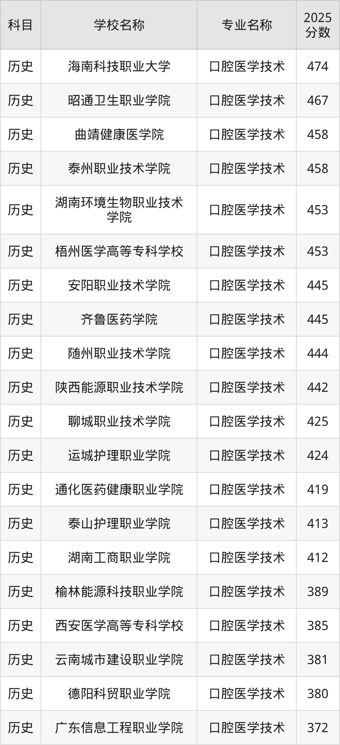 通过上文大家可以知晓,在贵州省内招口腔医学技术专业的院校数量较少,所以下文将为2026届高考生继续展示:省外大学的口腔医学技术专业2025年在贵州高考的录取情况,包含海南科技职业大学、昭通卫生职业学院、曲靖健康医学院、泰州职业技术学院、湖南环境生物职业技术学院。