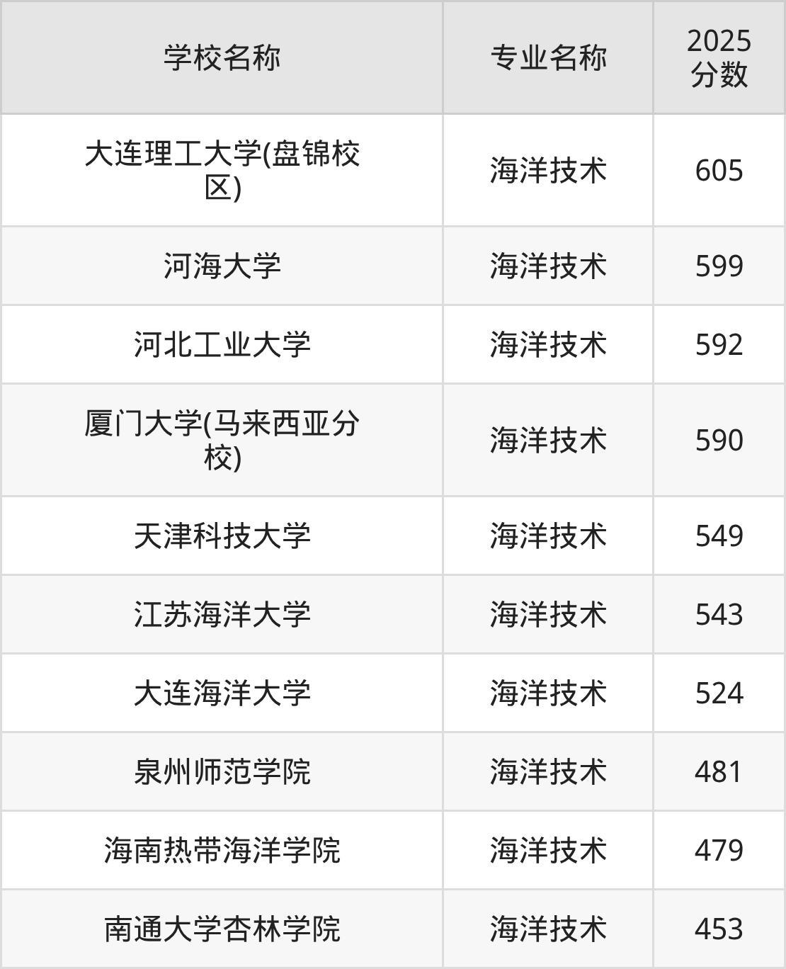 通过上文大家可以知晓,在山东省内招海洋技术专业的院校数量较少,所以下文将为2026届高考生继续展示:省外大学的海洋技术专业2025年在山东高考的录取情况,包含大连理工大学(盘锦校区)、河海大学、河北工业大学、厦门大学(马来西亚分校)、天津科技大学。