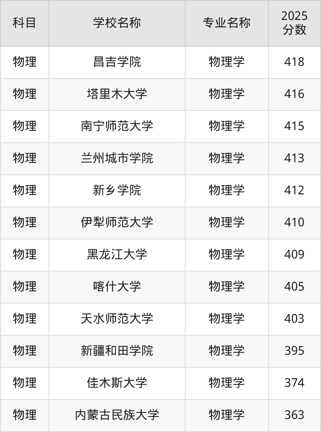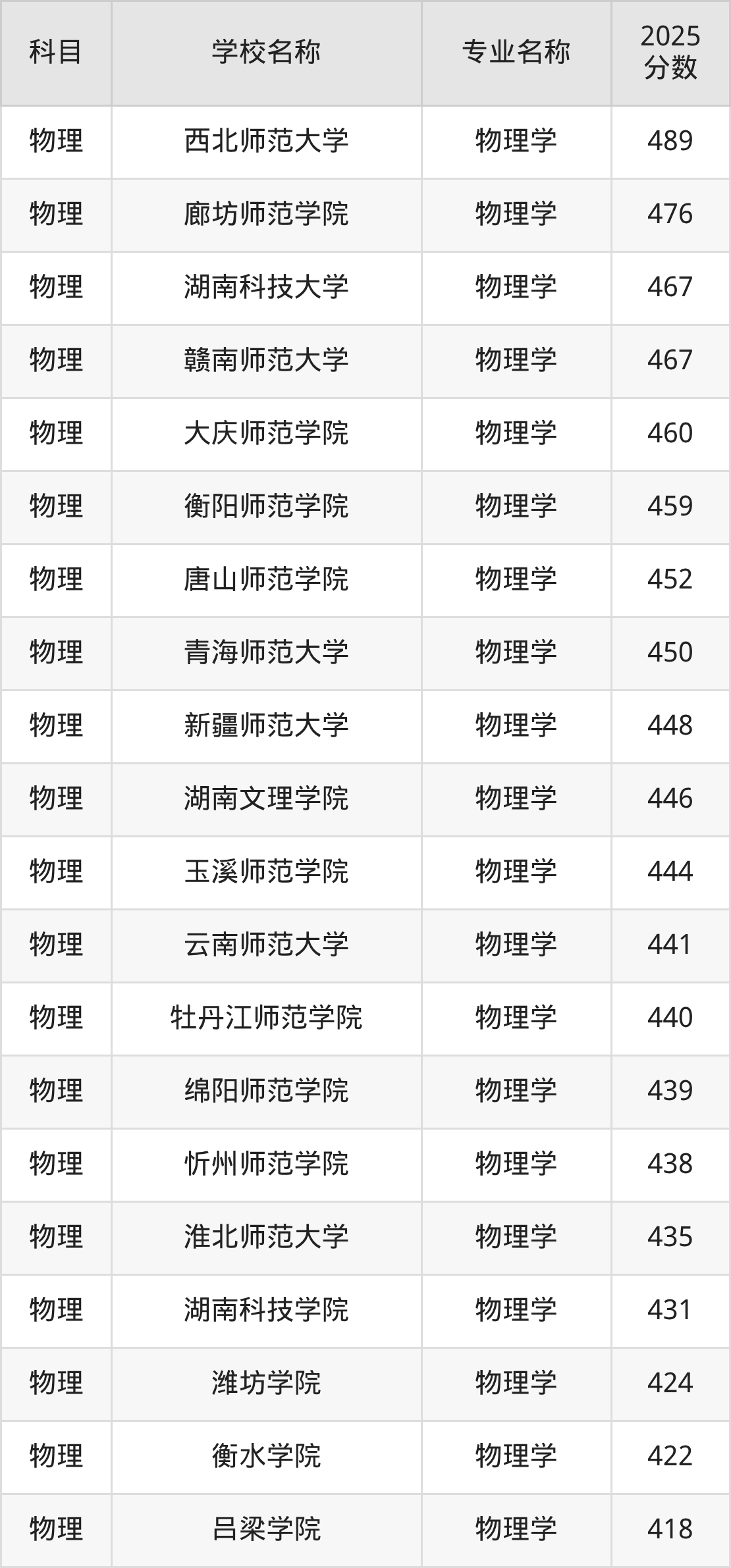 | 白城师范学院 | 物理学(师范类) | 449 |