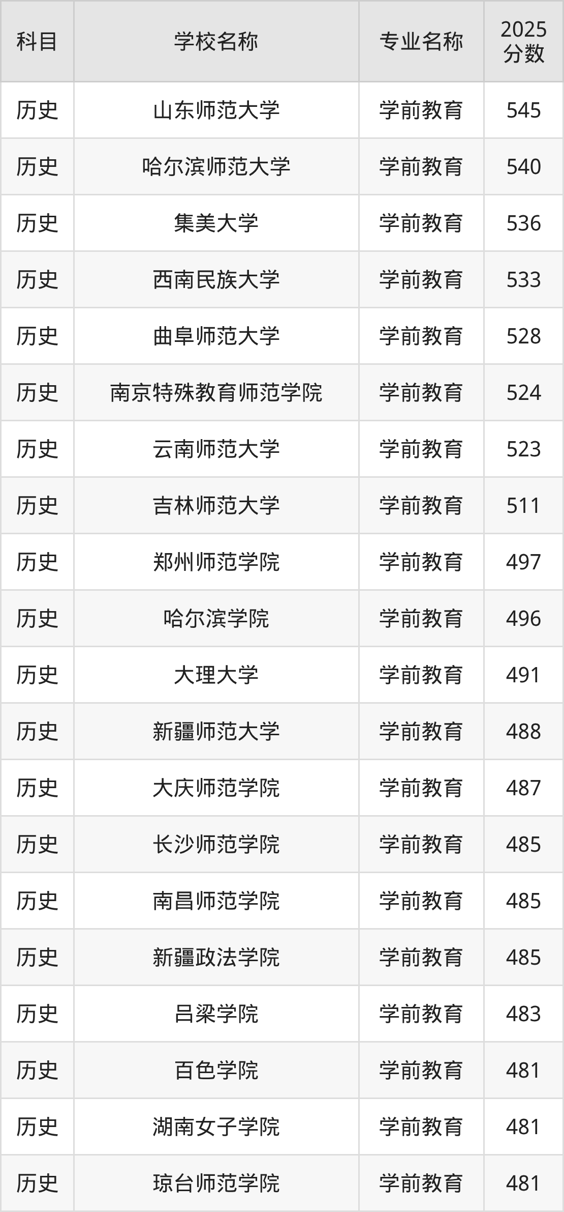 | 辽东学院 | 学前教育(师范 类) | 481 |