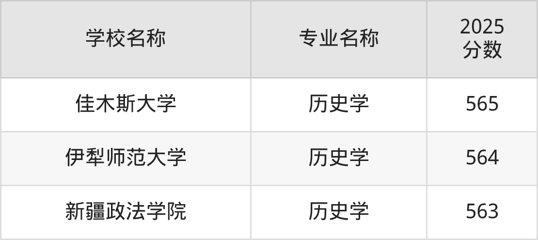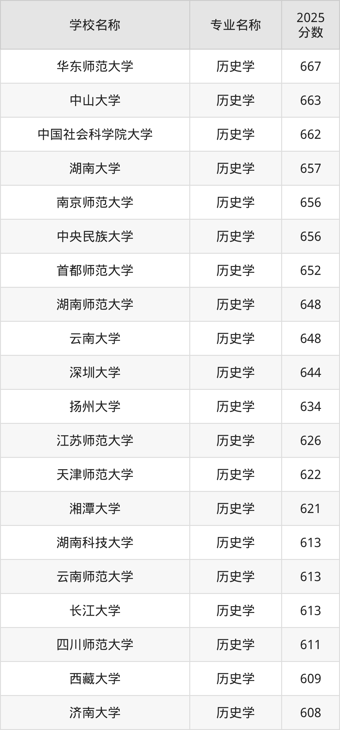 通过上文大家可以知晓,在浙江省内招历史学专业的院校数量较少,所以下文将为2026届高考生继续展示:省外大学的历史学专业2025年在浙江高考的录取情况,包含华东师范大学、中山大学、中国社会科学院大学、湖南大学、南京师范大学。