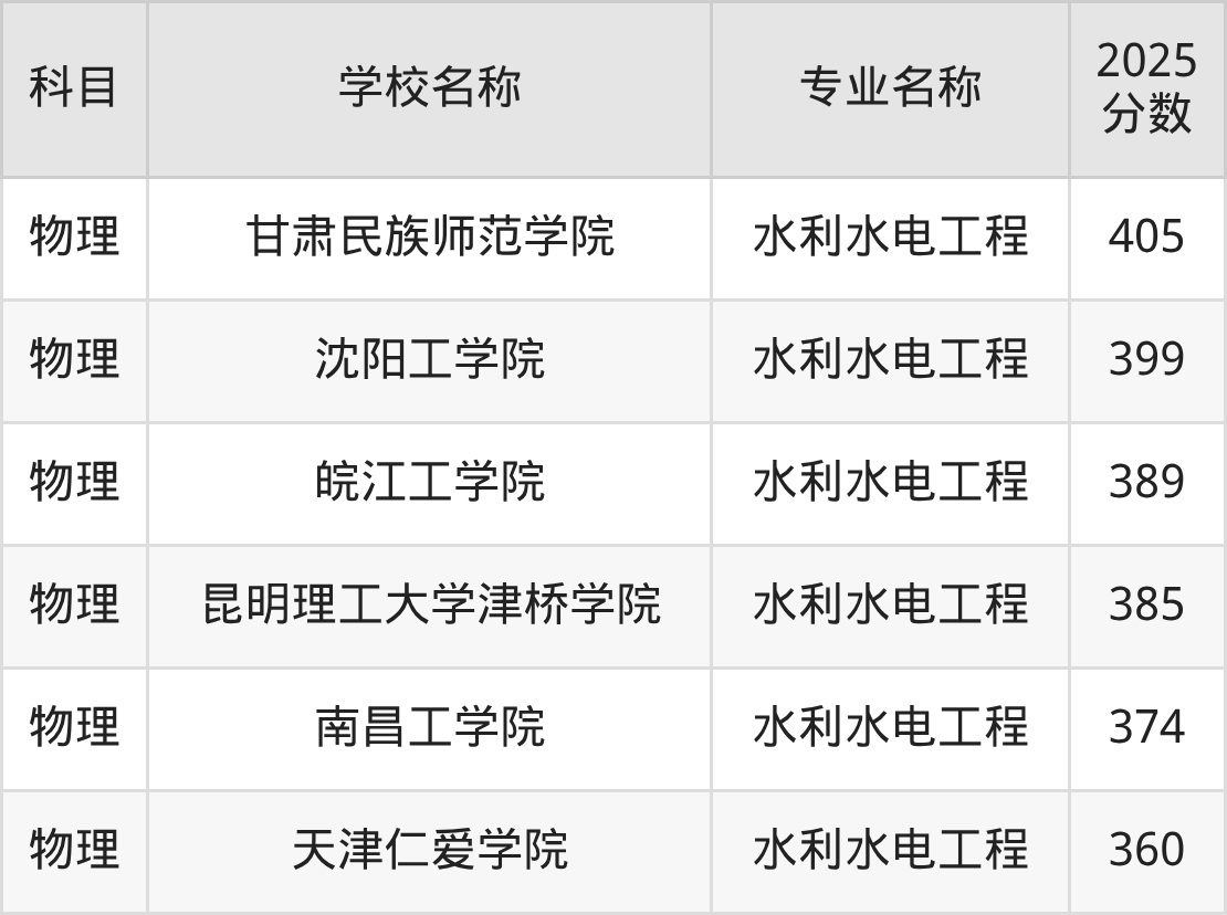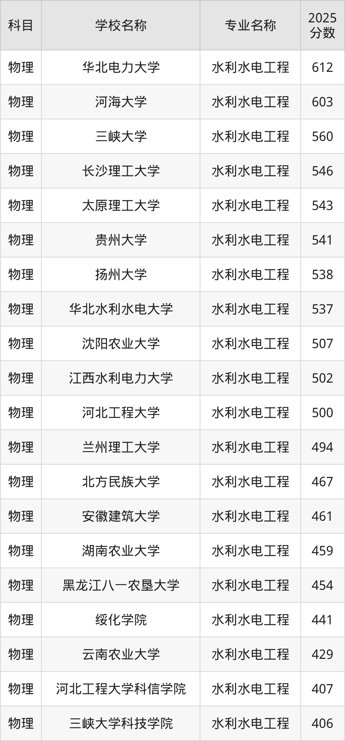 通过上文大家可以知晓,在吉林省内招水利水电工程专业的院校数量较少,所以下文将为2026届高考生继续展示:省外大学的水利水电工程专业2025年在吉林高考的录取情况,包含华北电力大学、河海大学、三峡大学、长沙理工大学、太原理工大学。