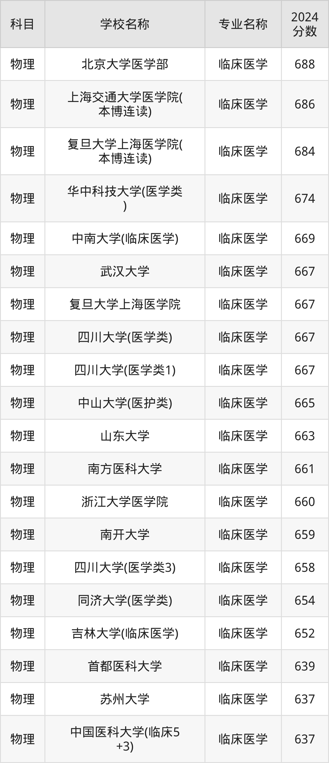 通过上文大家可以知晓,在福建省内招临床医学专业的院校数量较少,所以下文将为2026届高考生继续展示:省外大学的临床医学专业2024年在福建高考的录取情况,包含北京大学医学部、上海交通大学医学院(本博连读)、复旦大学上海医学院(本博连读)、华中科技大学(医学类)、中南大学(临床医学)。