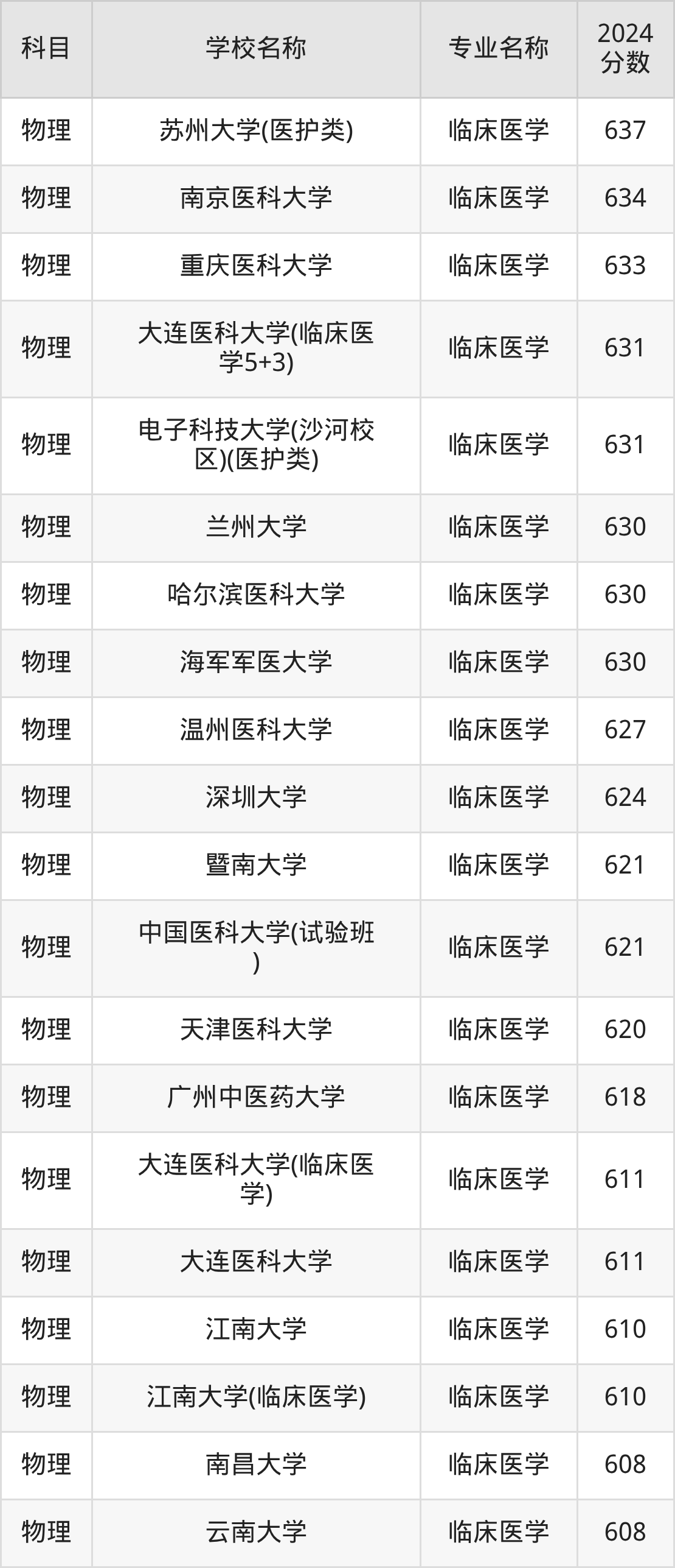在直接以“临床医学”的名称招生的福建省大学中,福建医科大学(临床医学其它)的分数线最高、排名第一名,在物理组的最低分是631分,全省排名前6263位的高考生才有较大机会被录取。